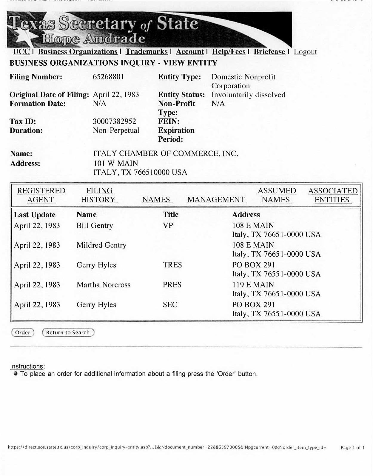 Chamber Involuntarily Dissolved in August 2007 « previous story album next » Chamber entity history — The Italy Chamber of Commerce began in 1983. (Texas Secretary of State) Download original photo