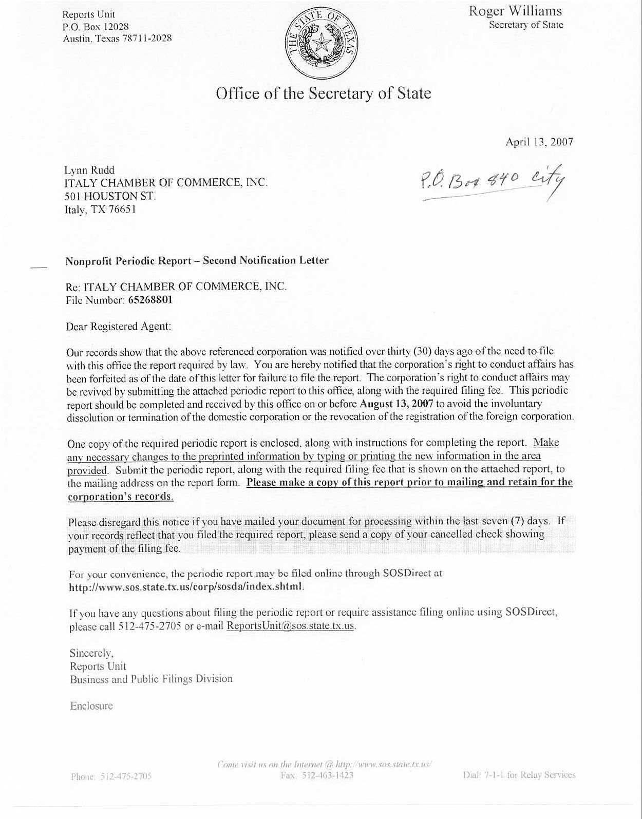 Chamber Involuntarily Dissolved in August 2007 « previous story album next » Last notice (Texas Secretary of State) Download original photo