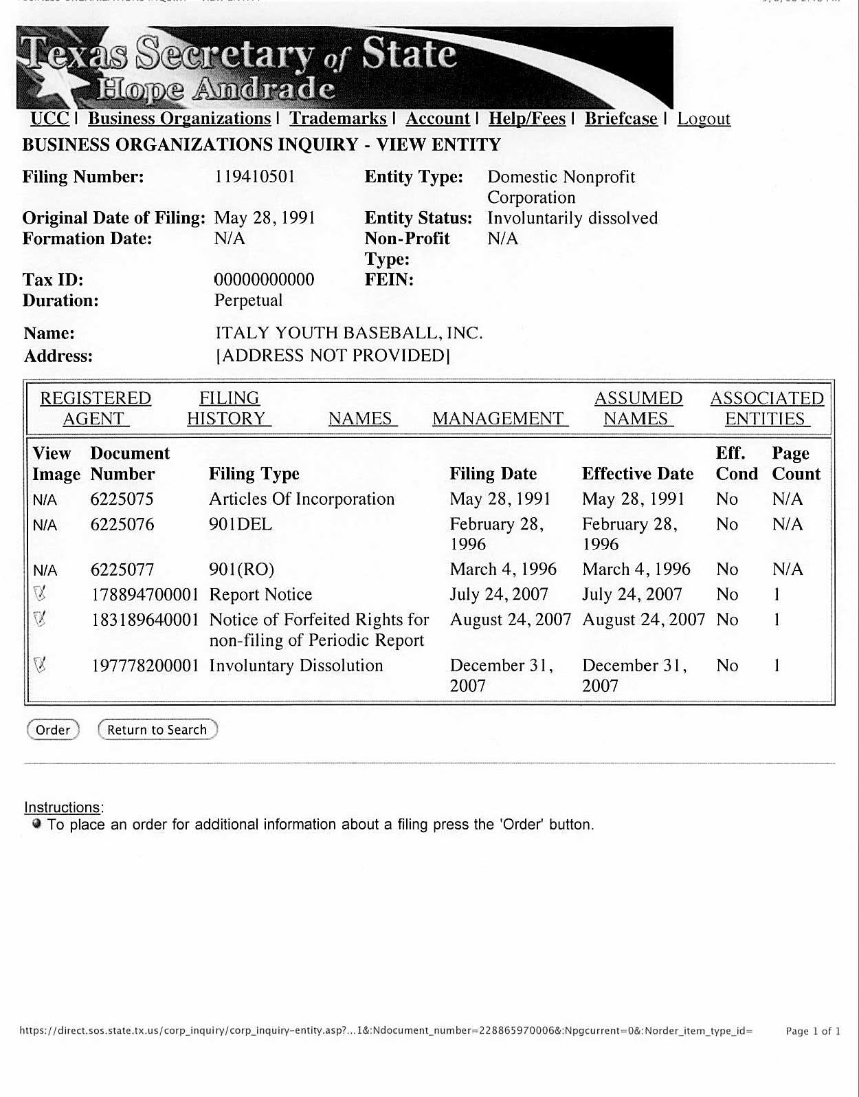 Italy Youth Baseball record — Record showing the incorporation of the Italy Youth Baseball, Inc. in 1991 as well as it’s dissolution at the very end of last year. (Texas Secretary of State website)