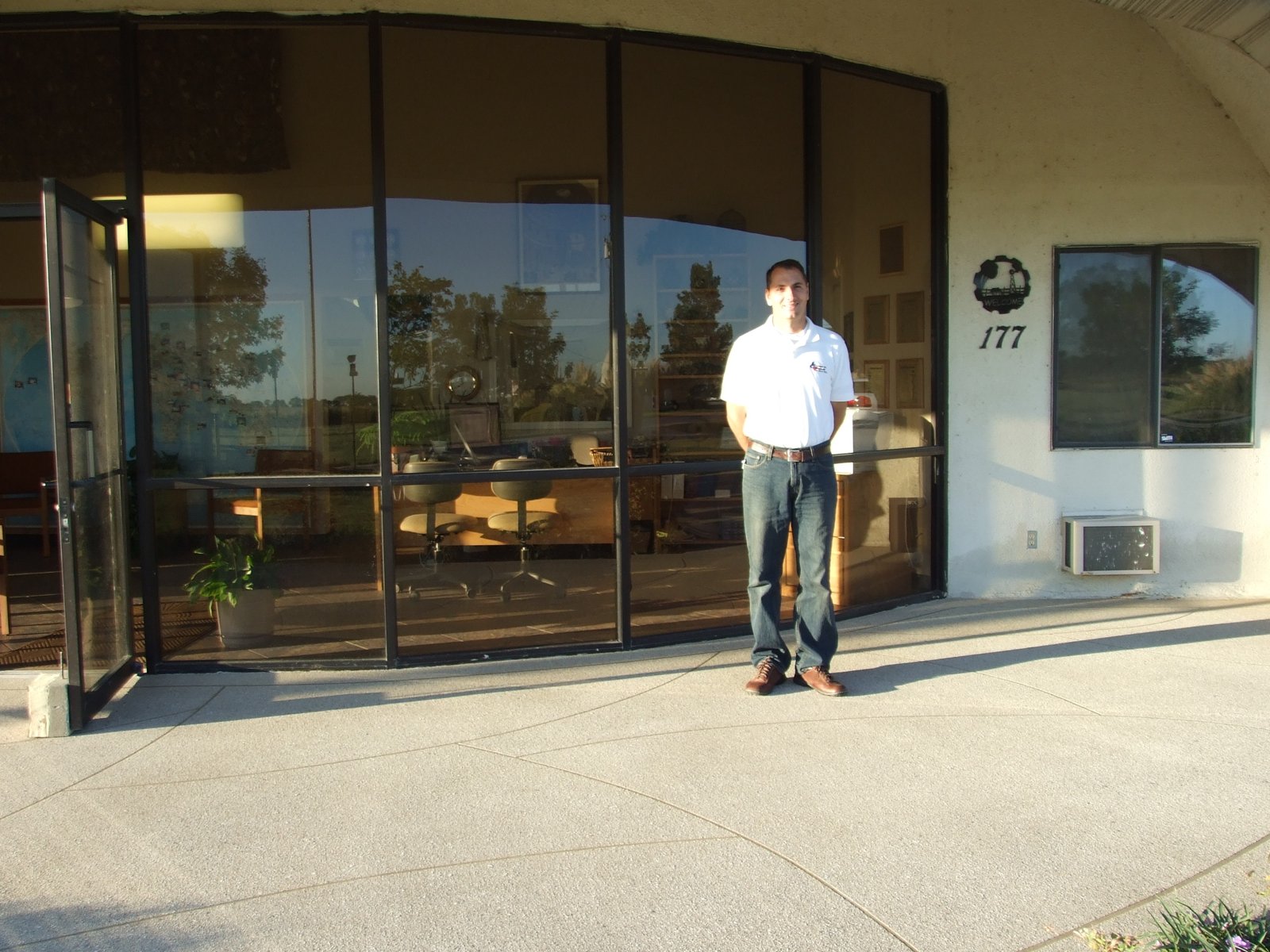 Todd Graham — Todd Graham standing on the beautiful decorative concrete porch he recently did for Monolithic Constructors. Lots of hard work went into this but as you can see it is worth it. (Cindy Sutherland)