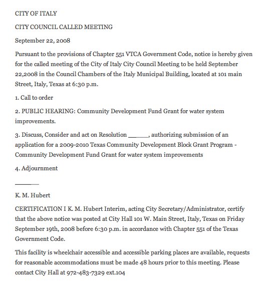 City council agenda 09/22/2008 — The council for the City of Italy has called a meeting to hold a public hearing concerning a Community Development Fund Grant for water system improvements. (City of Italy)