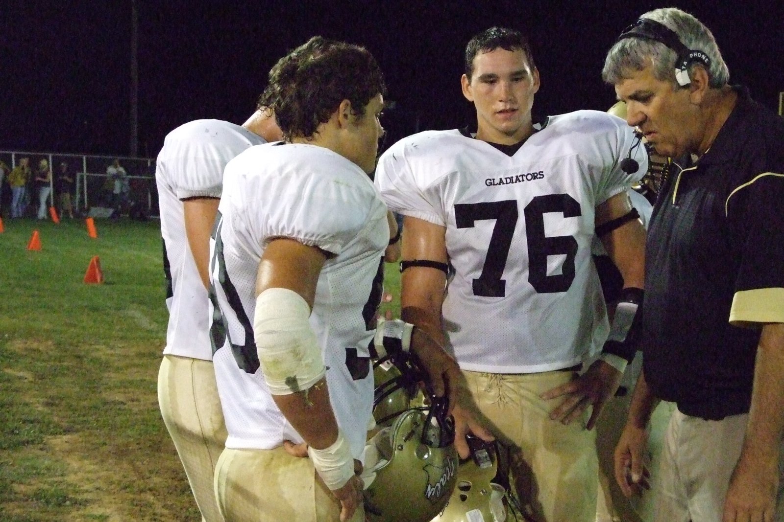 Italy wins district opener 40-7 « previous story album next » Coach Coleman and players — #76-Jeff Claxton (Sugar), #50-Ethan Simon, #66-Trent Morgan work with Coach Coleman on the sidelines. (Alex and Justin) Download original photo