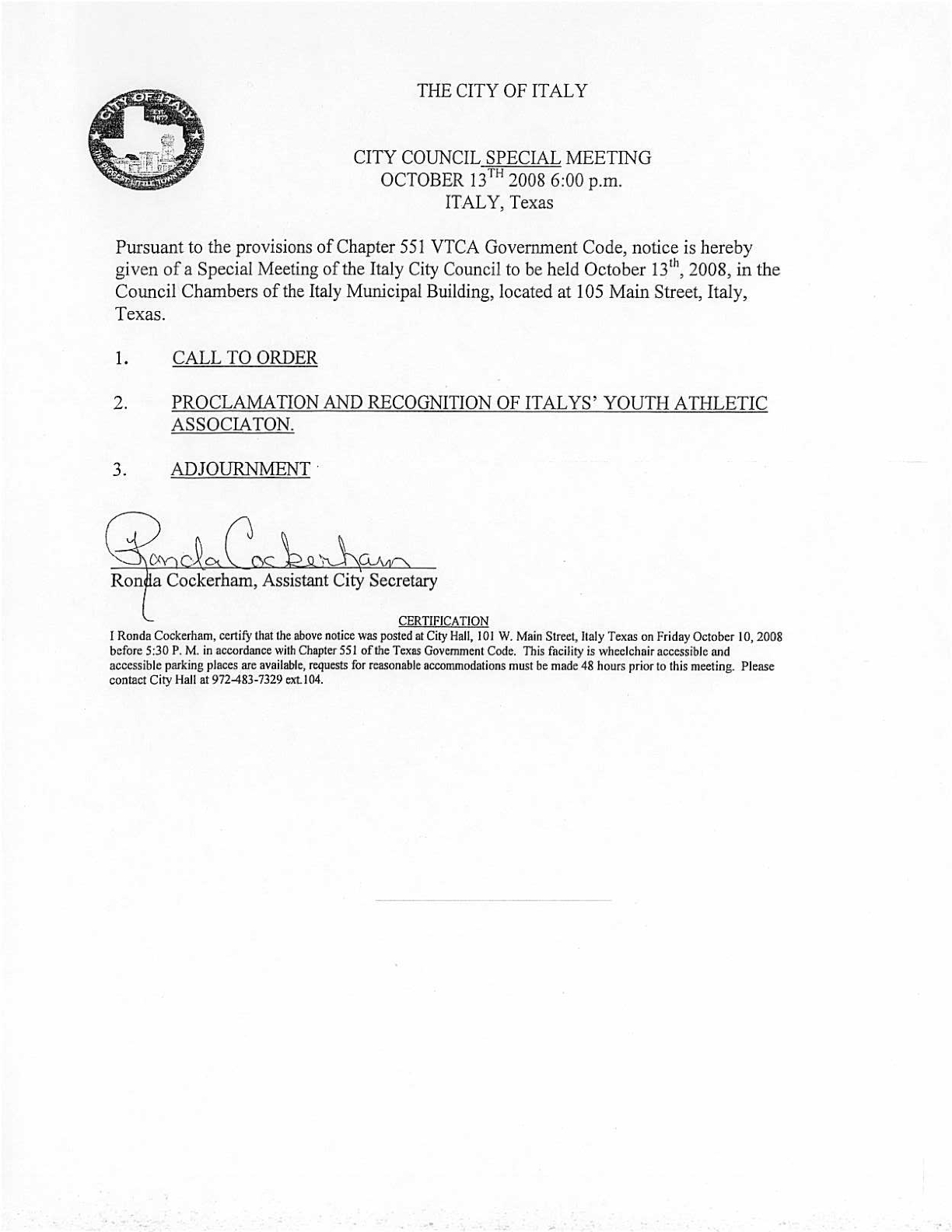 Special and regular meetings for Italy city council « previous story album next » Special council meeting — The Italy city council will recognize the Italy’s Youth Athletic Association. (City of Italy) Download original photo