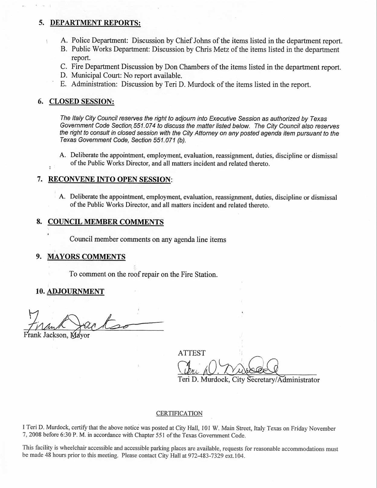 Garcia and Trees to address council / EDC discussion planned « previous story album next » Agenda page 2 — Page 2 of the Italy City Council meeting agenda for November 10, 2008. (City of Italy) Download original photo