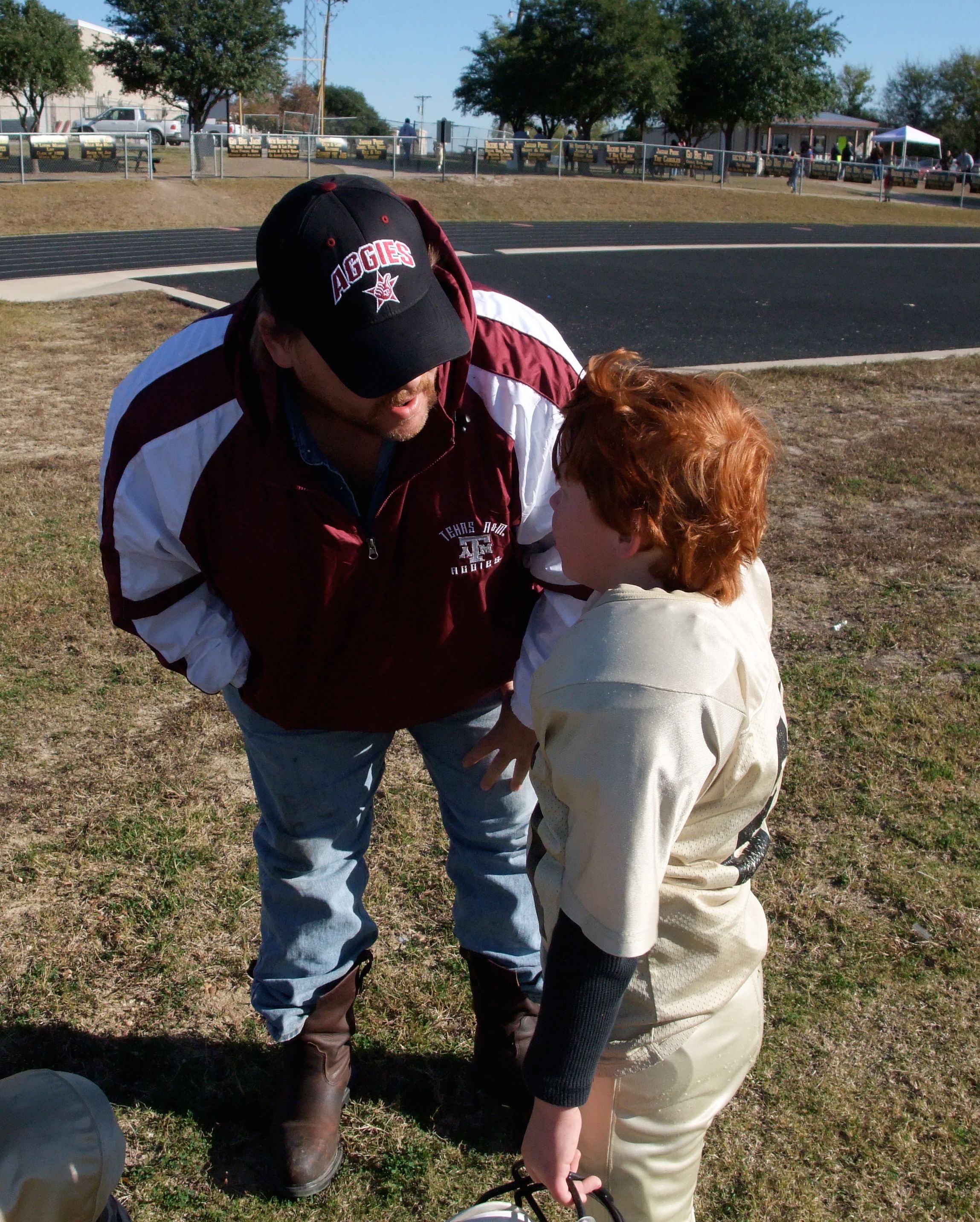 The IYAA competes in Conference Championship games « previous story album next » Dad Lends Advice — Levi Stark intently listens to his father and former football player Charlie Stark at halftime. (Barry Byers) Download original photo