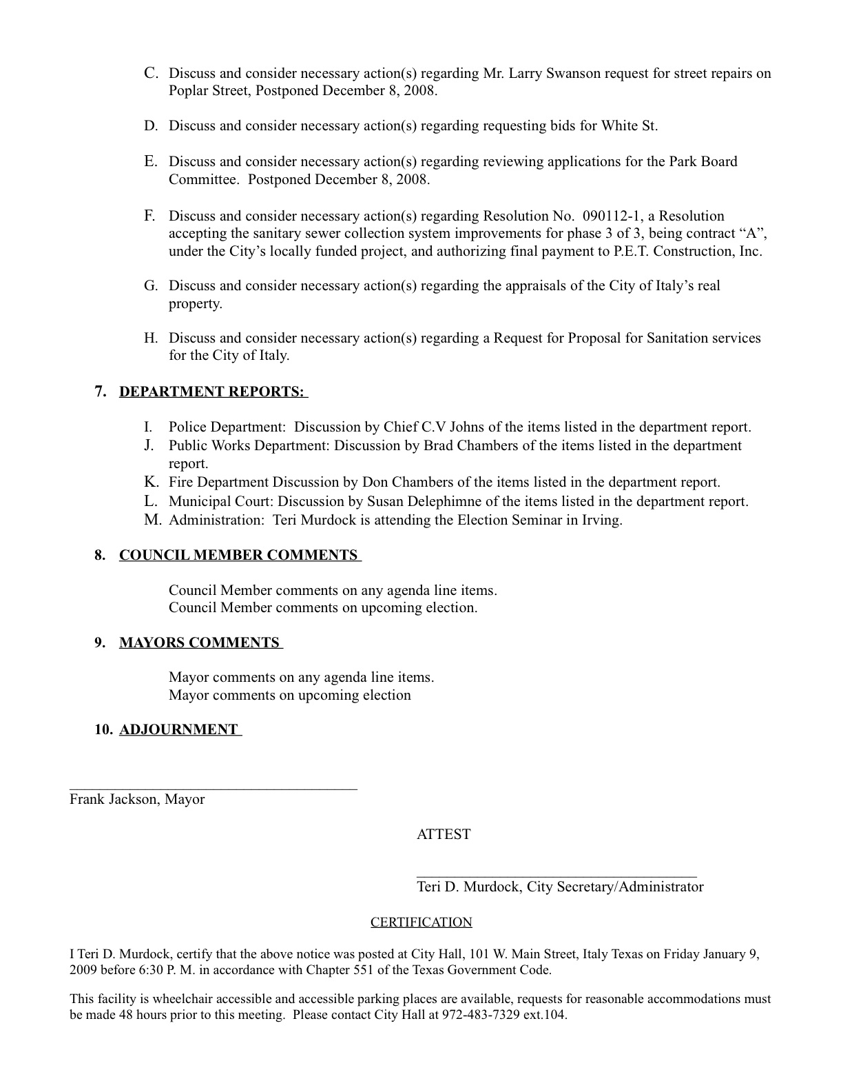 Agenda: Hearing and action on old nursing home zoning « previous story album next » Agenda page 2 — Page two of the city council agenda for January 12, 2009. (City of Italy) Download original photo