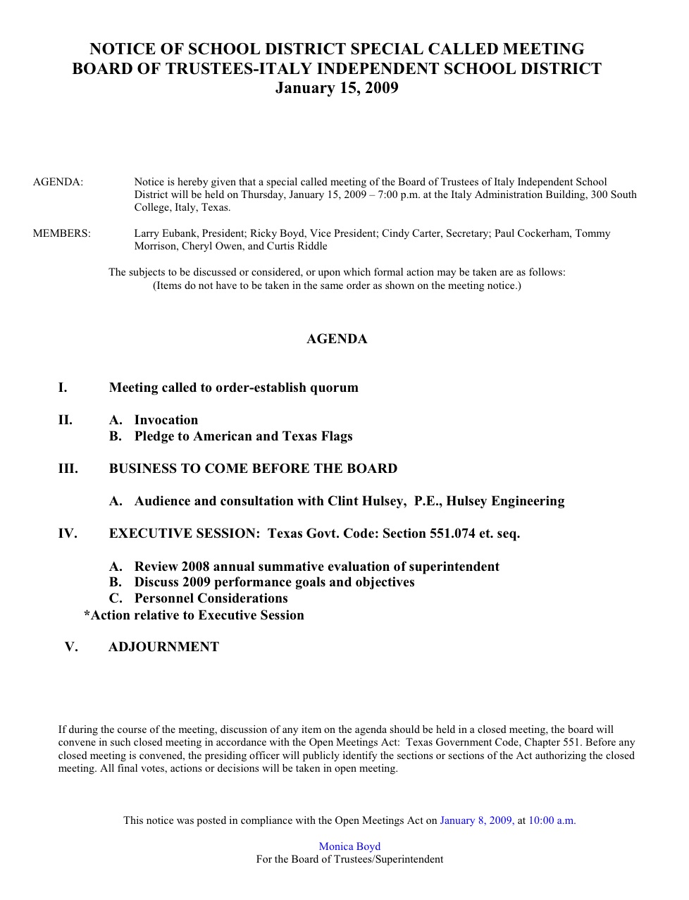 Agenda: Husley Engineering presentation « previous story album next » Board Meeting Agenda — Agenda for the Italy ISD Board of Trustees meeting for January 15, 2008. (Italy ISD) Download original photo