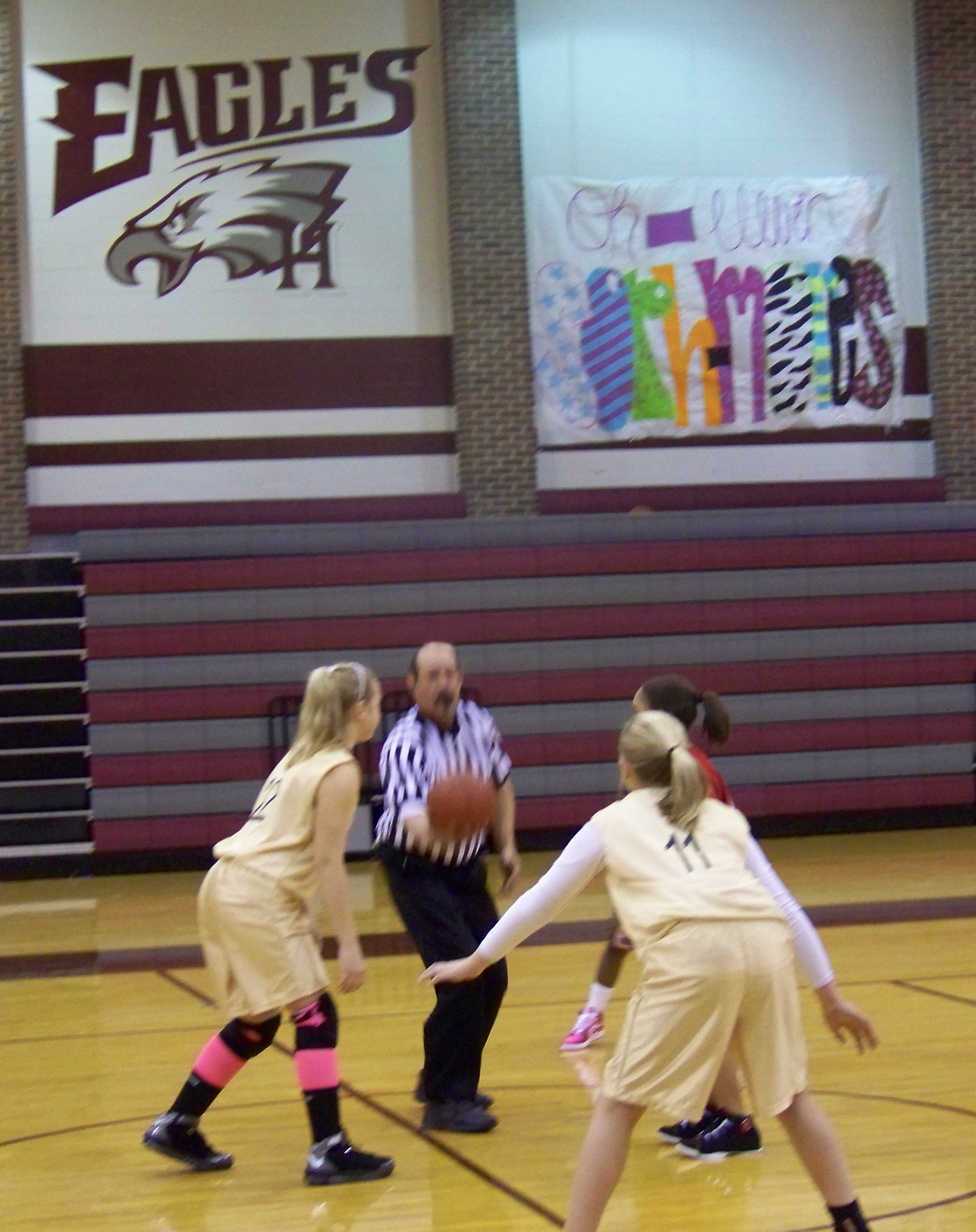 Jac and Maddy Tip-Off — Italy 23 prepares to tip-off against Hillsboro Red at the Hillsboro Big Gym. The “Twin Towers” were unstoppable as #22 Jaclynn Lewis and #11 Madison Washington combined for 29 of Italy’s 54-points. (Kelly Lewis)