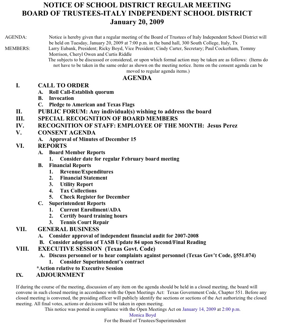 Agenda: Italy ISD financial audit, tennis court repair « previous story album next » Italy ISD Agenda — Agenda for Italy ISD Board of Trustees meeting for Tuesday, January 20, 2009. (Italy ISD) Download original photo