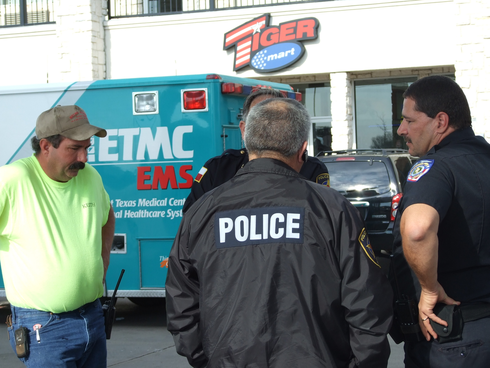 Backup needed at Tiger Mart « previous story album next » Nice Job — Rescue personnel share notes just before the ambulance leaves for the hospital. (Barry Byers) Download original photo