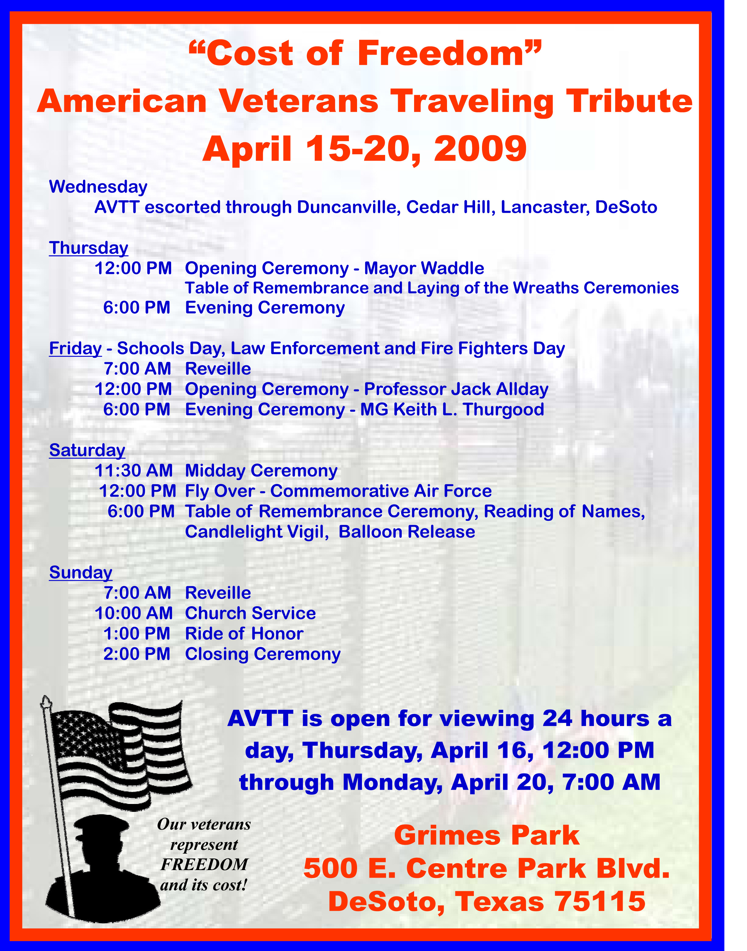 “Cost of Freedom” Veterans Traveling Tribute in DeSoto April 15-20 « previous story album next » American Veterans Traveling Tribute (Submitted Story) Download original photo
