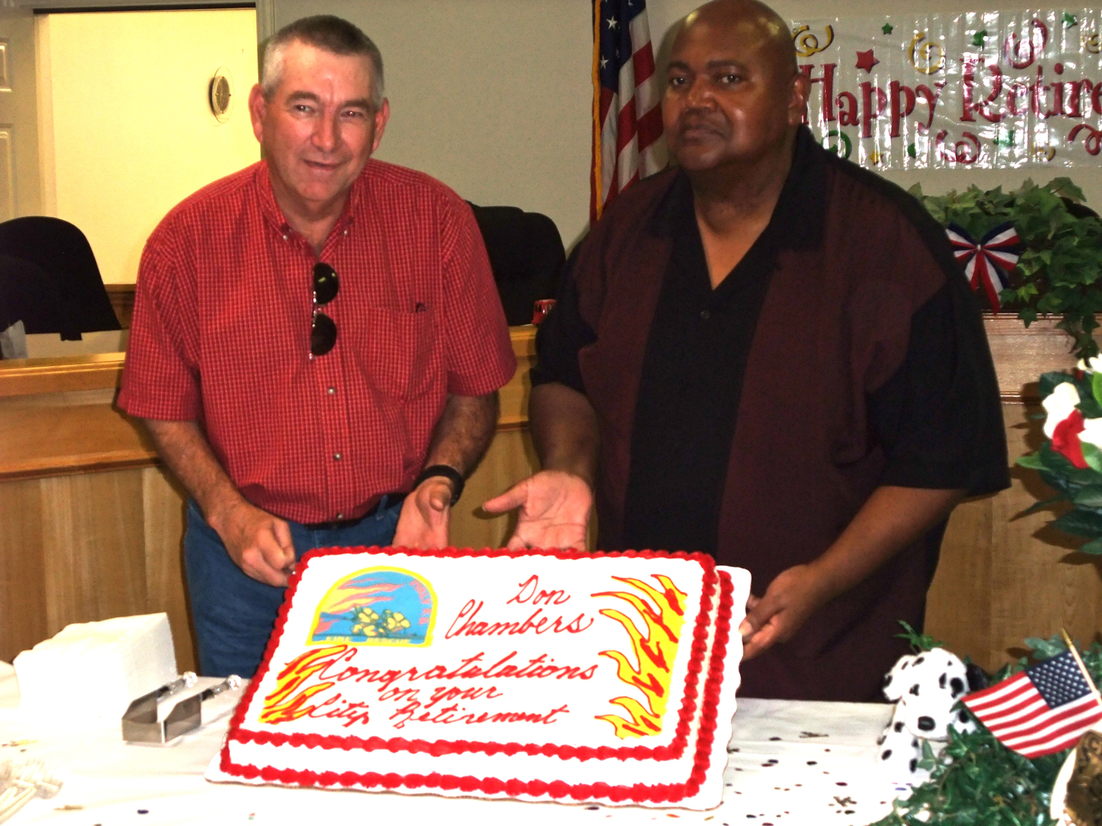 Fire Chief Donald Chambers and Mayor Jackson display the cake — Italy Fire Chief Donald Chambers is honored with a retirement reception hosted by Mayor Frank Jackson and fellow City of Italy employees. (Barry Byers)
