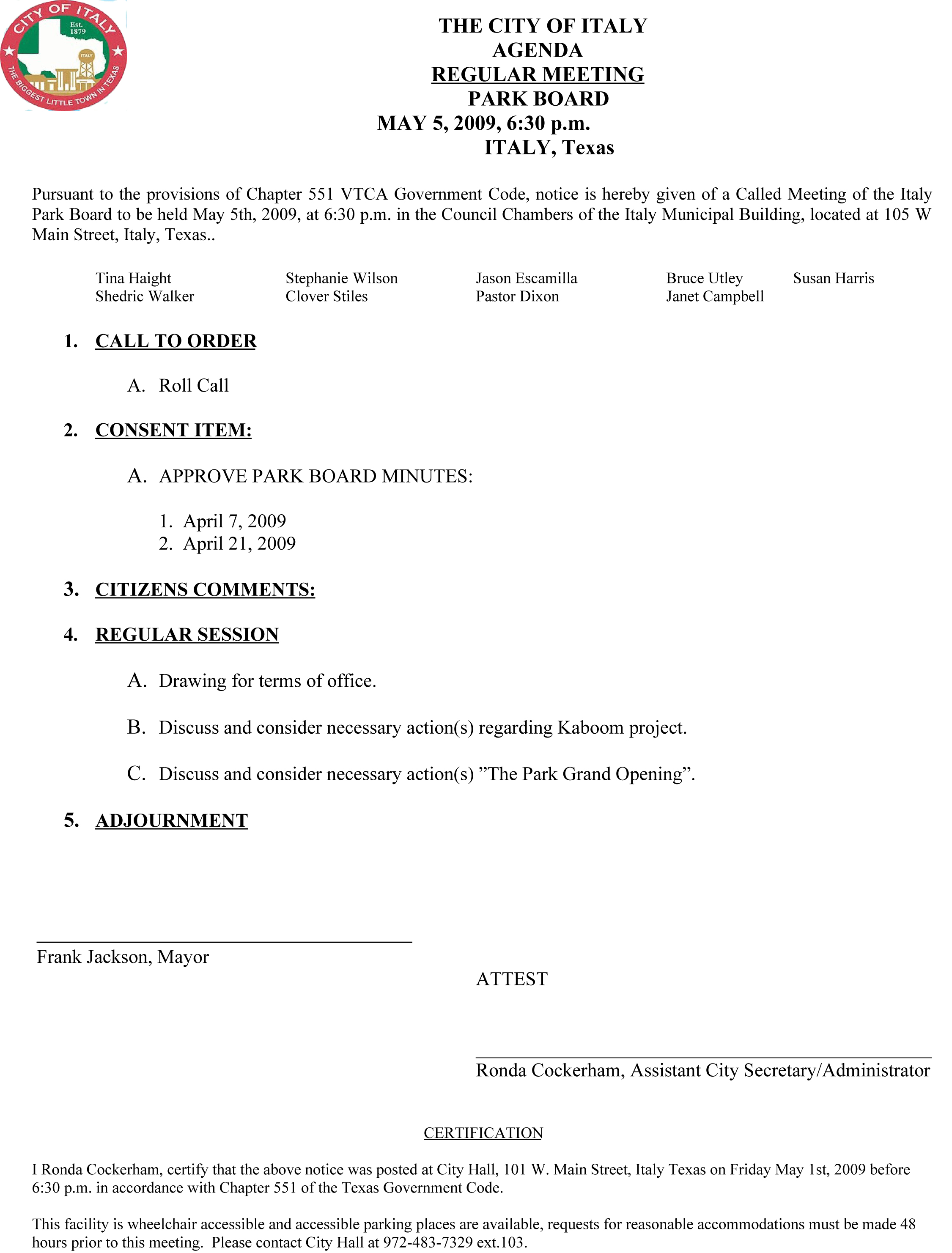 Agenda: Italy Park Board Called Meeting May 5, 2009 « previous story album next » Download original photo