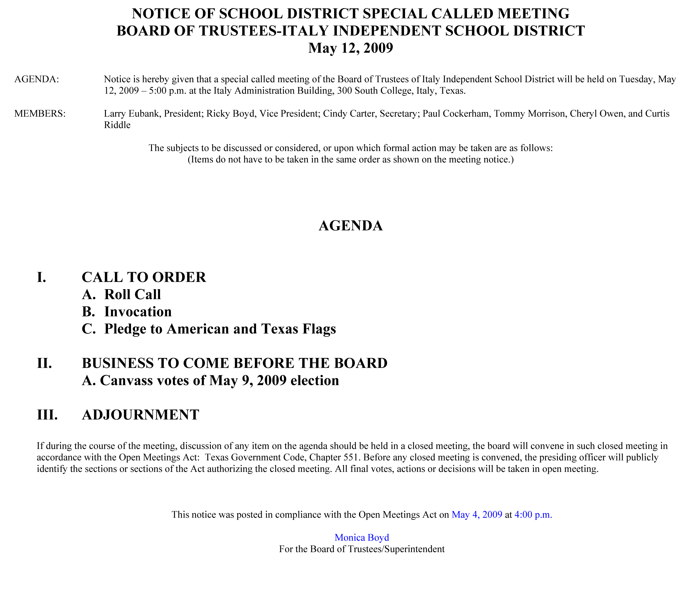 Agenda: Italy ISD School Board Called Meeting, May 12, 2009 « previous story album next » Download original photo