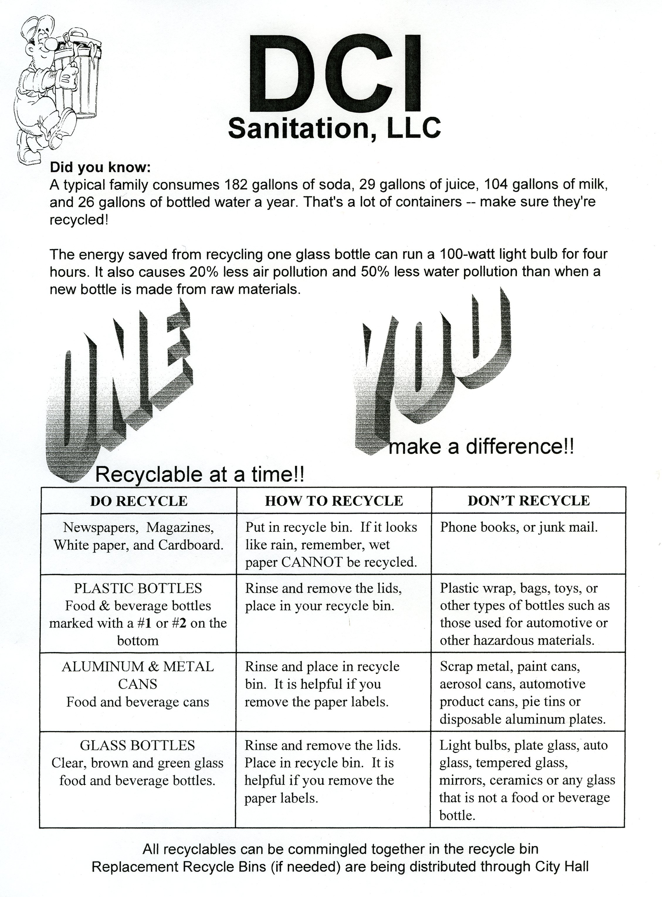 Answers to questions — Copies of this flyer are being passed out with the small Recycle bins that are available at City Hall in downtown Italy. We suggest keeping the chart within easy access. The chart works by reading one row at a time, left to right.