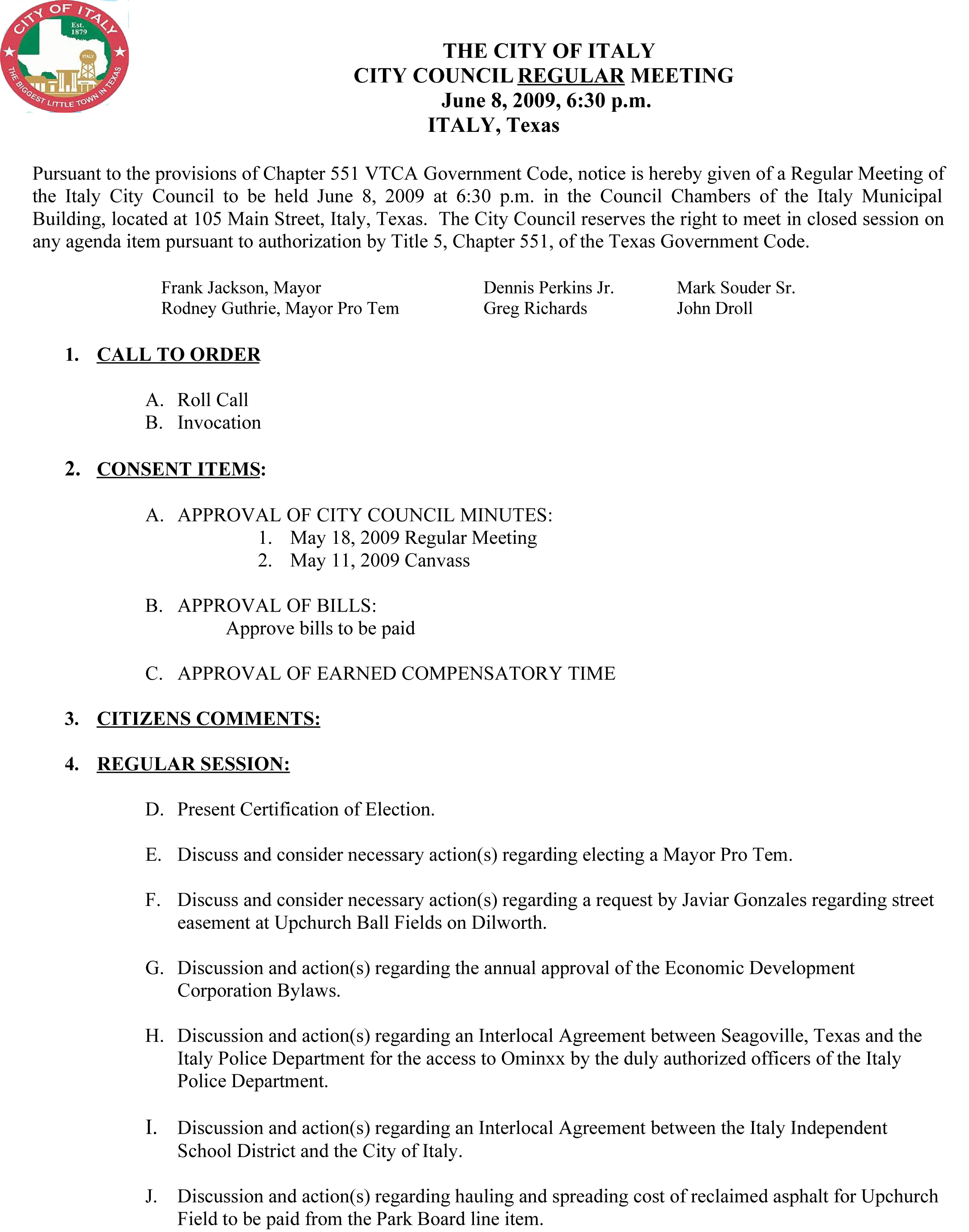 Agenda: City Council Meeting June 8, 2009