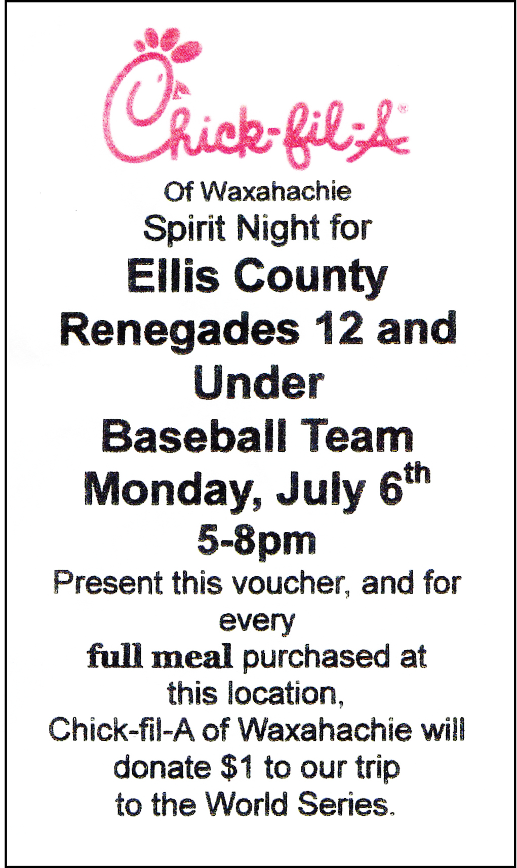 Present voucher — Present this voucher, and Chick-fil-A® will donate $1.00 for every full meal purchased to the Ellis County Renegades baseball team in support of their trip to the World Series.
