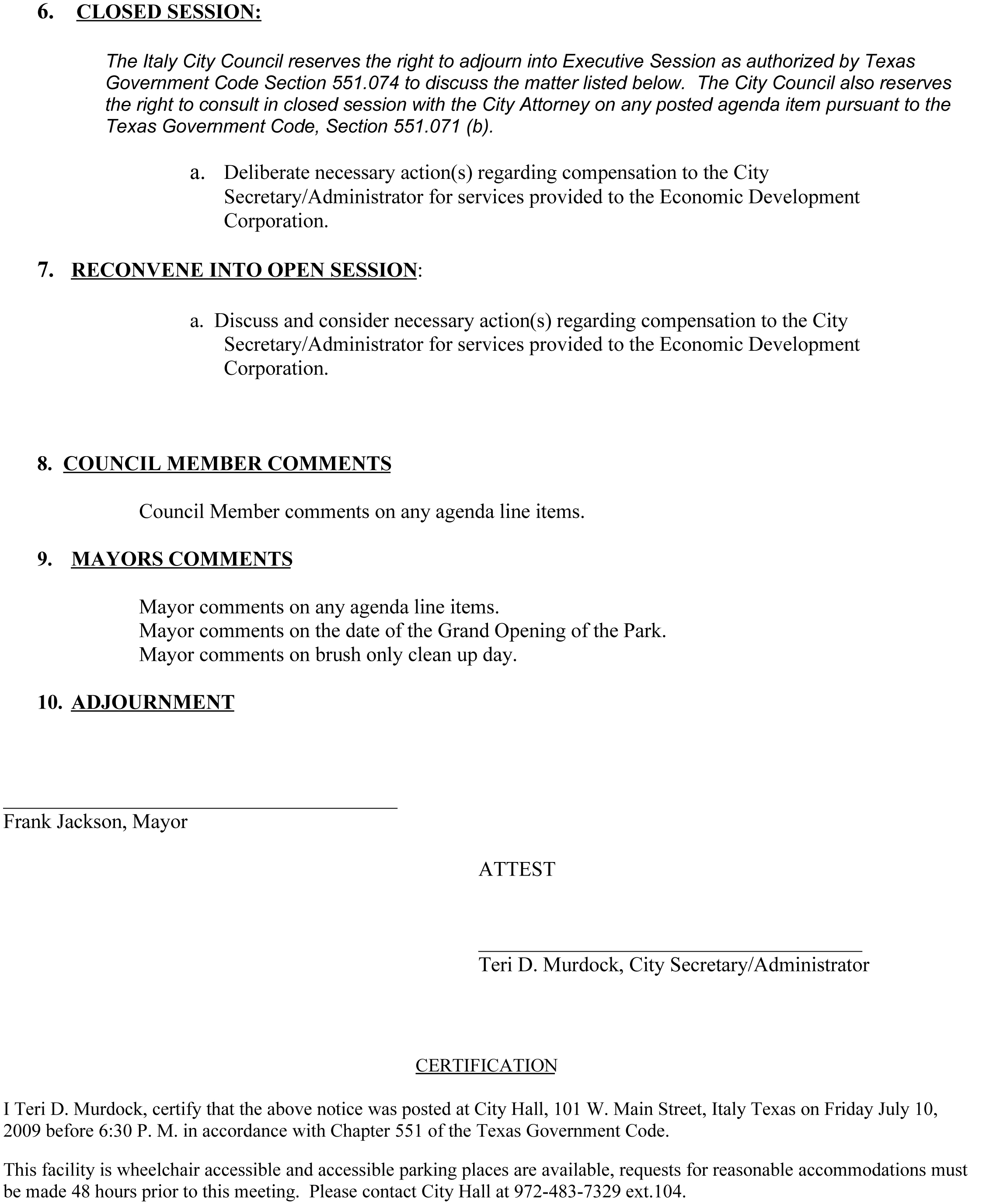 Agenda: City Council Meeting July 13, 2009 « previous story album next » (Page 2) (www.ci.italy.tx.us) Download original photo