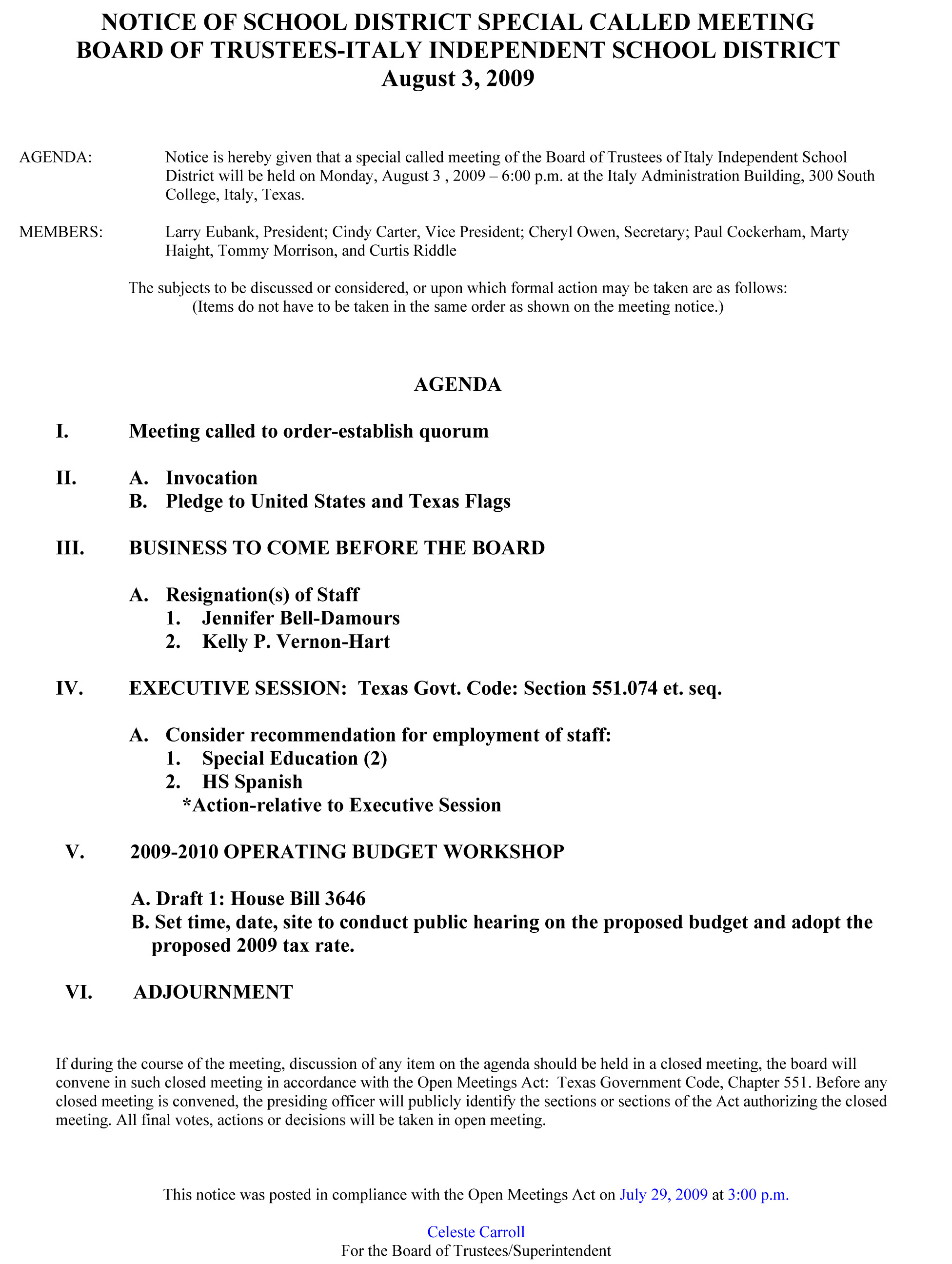 Agenda: Italy ISD School Board Called Meeting, August 3, 2009 « previous story album next » School Board Meeting Agenda, August 3, 2009 Download original photo