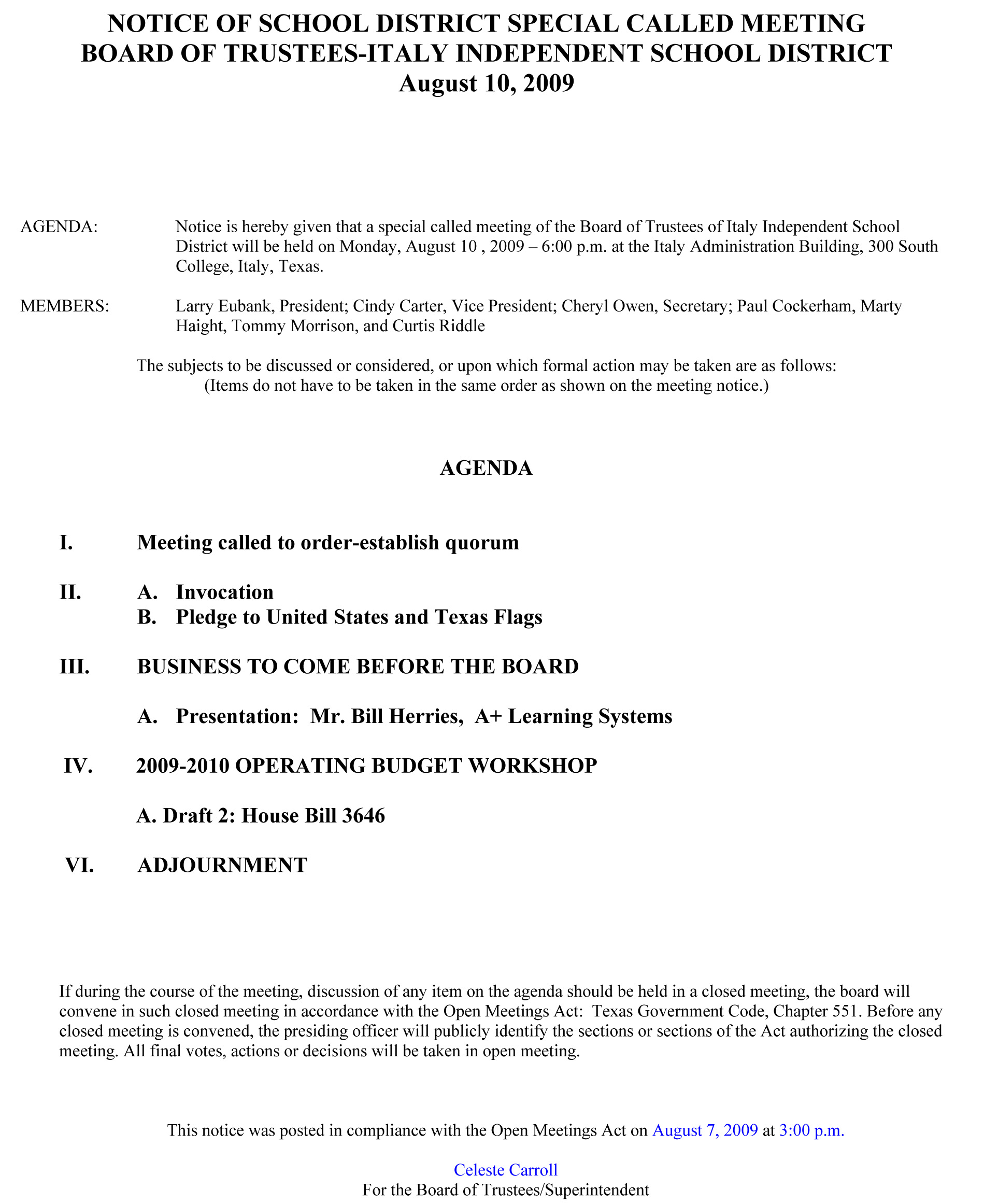 Agenda: Italy ISD School Board Meeting August 10, 2009 « previous story album next » August 10, 2009 – School Board Agenda Download original photo