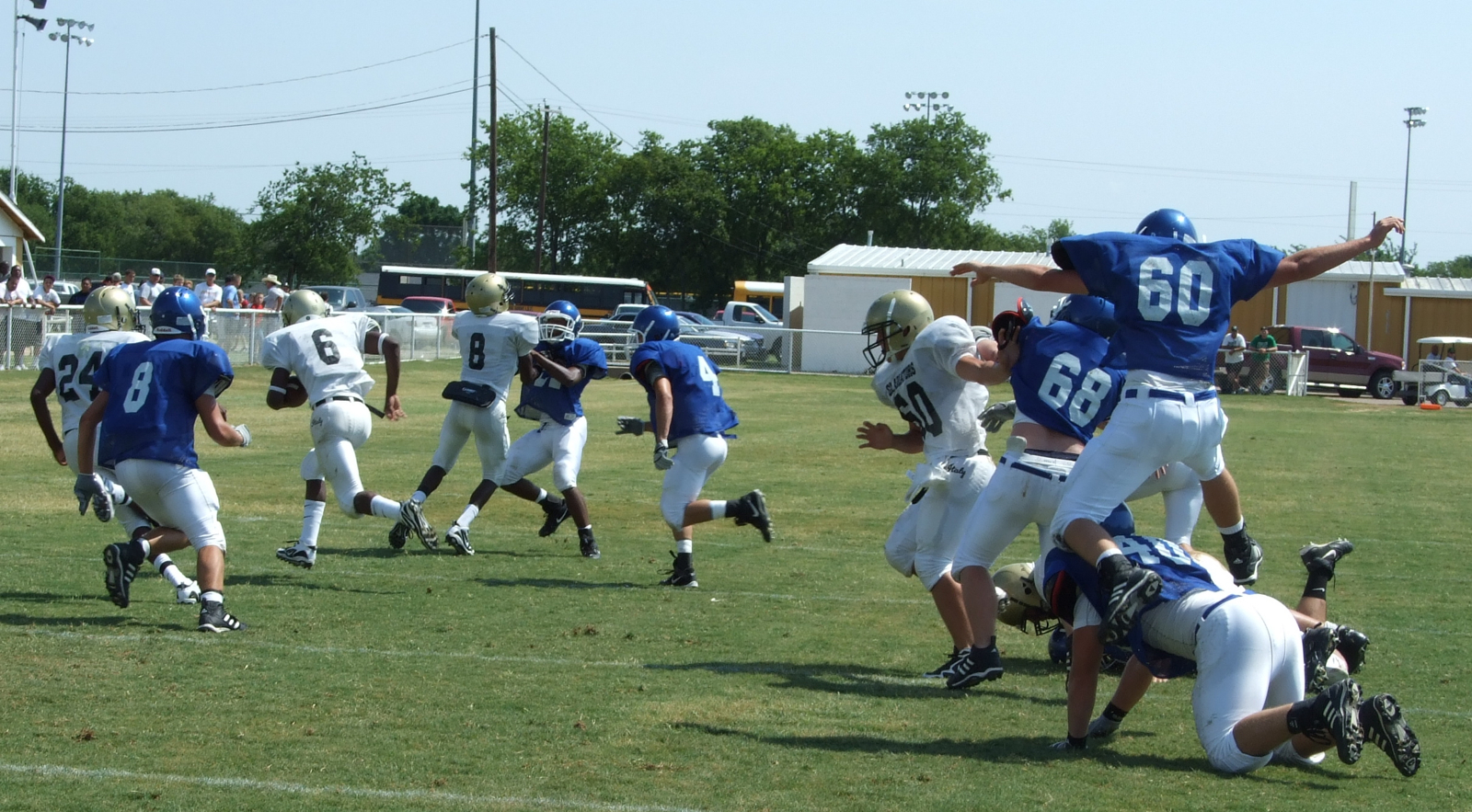 Gladiators make plays during Saturday’s football scrimmages « previous story album next » The “beast” is loose — Jasenio “Beast” Anderson breaks loose from a pack of Lions for a big gain. (Anne Sutherland) Download original photo