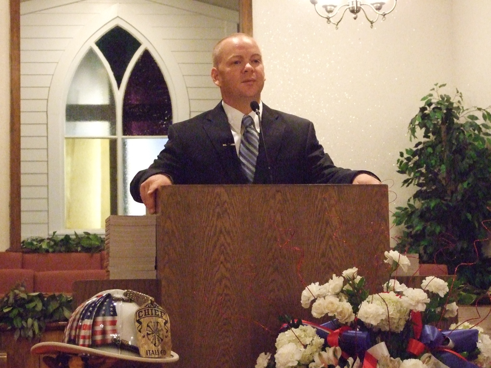Firemen Honored at First Baptist Church « previous story album next » Michael challenges — Michael Chambers reminds the firemen why they do the job they do. (Anne Sutherland) Download original photo
