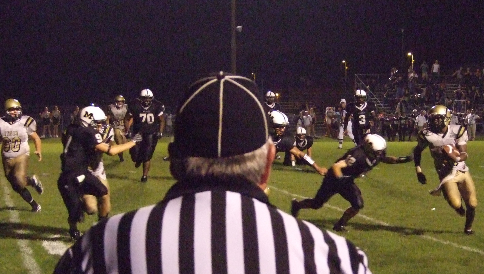 Needing 2 to tie — Italy’s gutsy quarterback, Jasenio Anderson(11), marches the Gladiators down the field 97-yards to tie the game late in the 4th, 34-34. With 1:14 remaining, he mastered a 51-yard drive to pull Italy within 2-points, 42-40. Then, with no time left in regulation, Anderson scored the 2-point conversion to tie the game and force overtime… (Anne Sutherland)