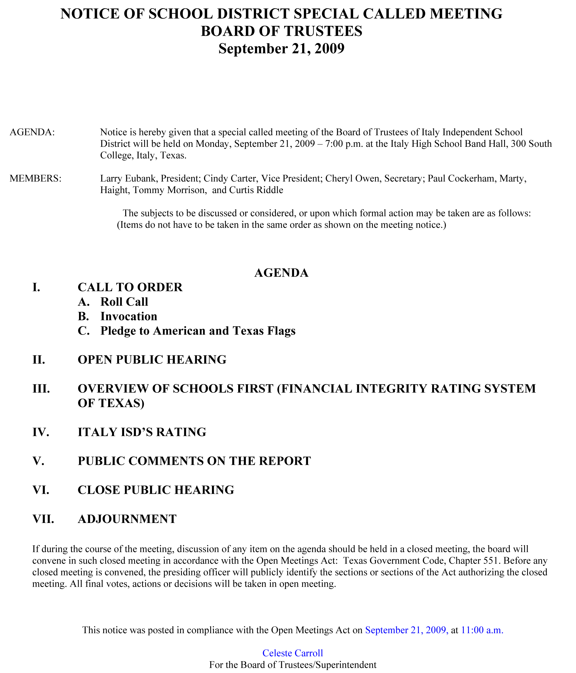Agenda: Italy ISD School Board Meetings September, 2009 « previous story album next » Called Meeting Agenda, Italy ISD School Board — September 21, 2009 (italyisd.org) Download original photo