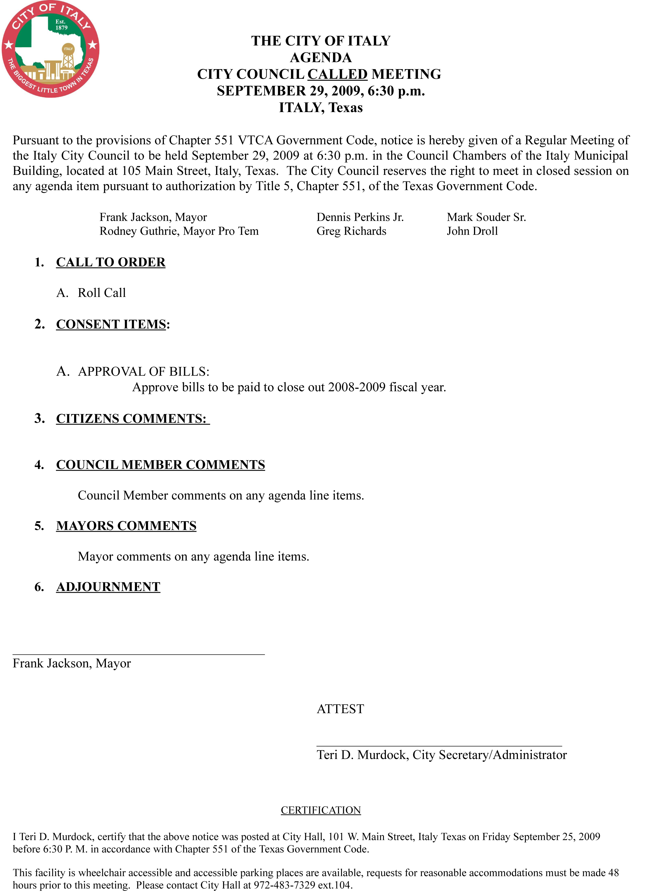 Agenda: Italy City Council Called Meeting September 29, 2009 « previous story album next » Agenda (www.ci.italy.tx.us) Download original photo
