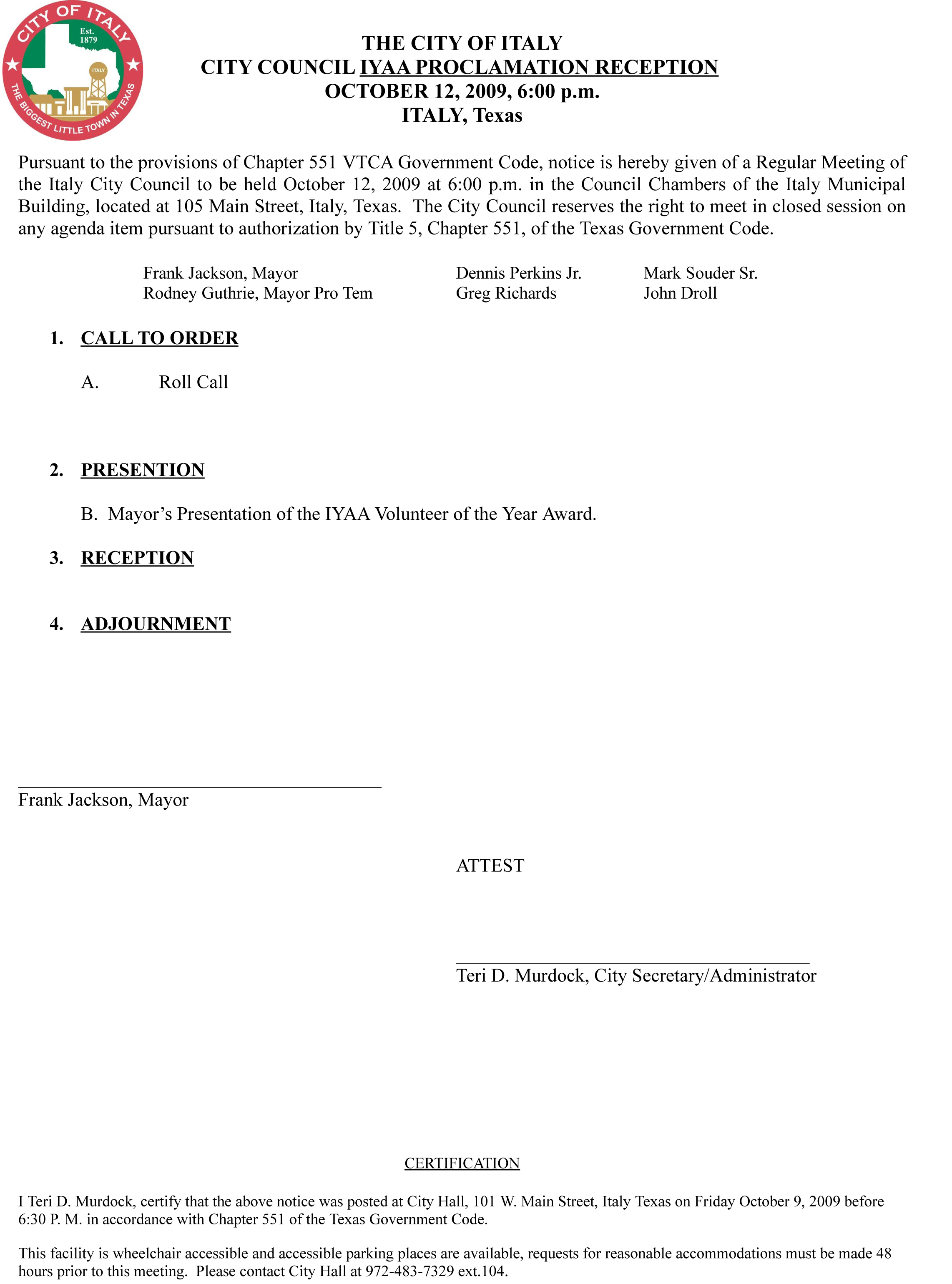 Agenda: City Council Meetings October 12, 2009 « previous story album next » Agenda: 6:00pm meeting Download original photo