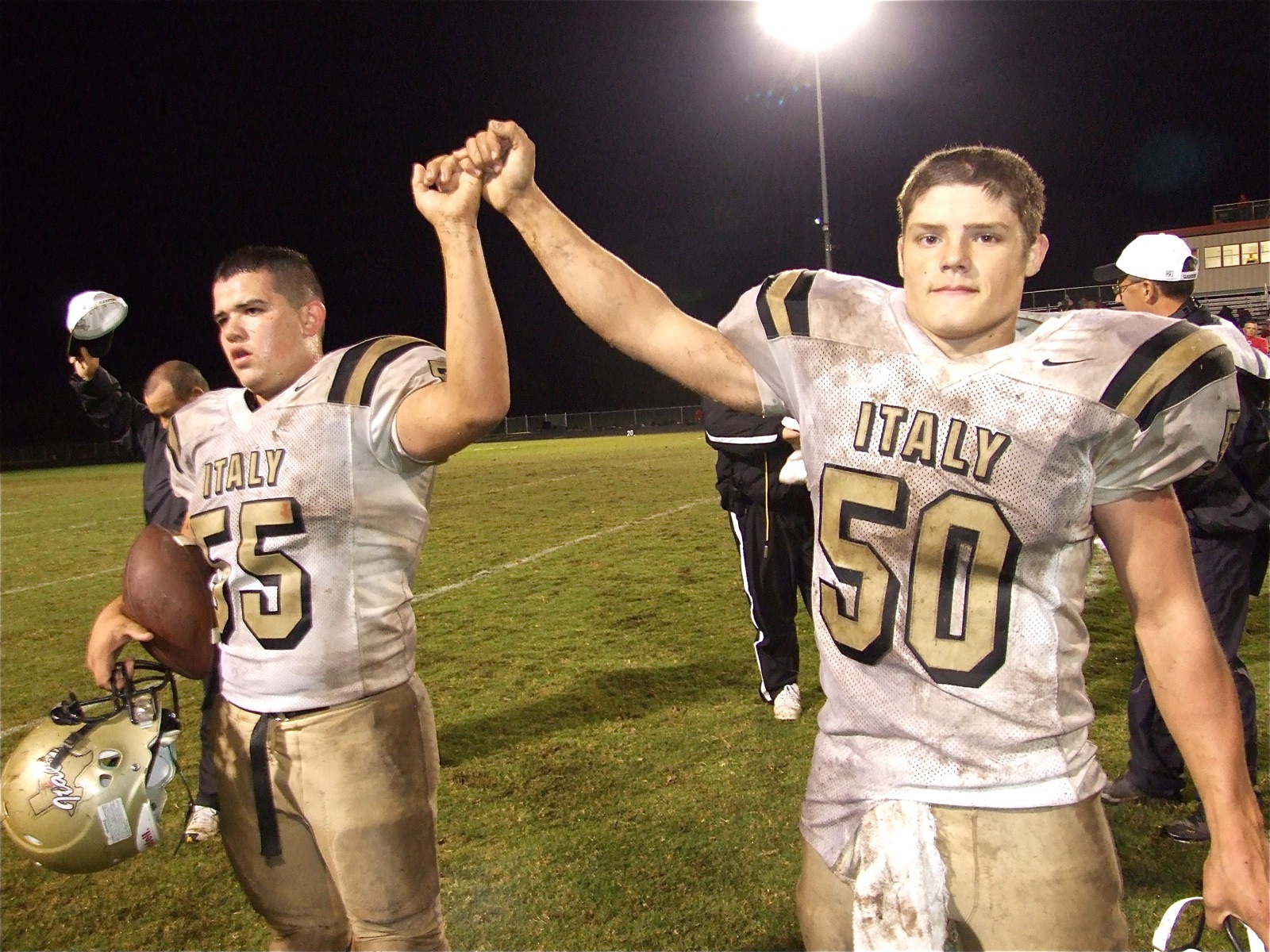 Ross Enriquez and Ethan Simon stand united — Ross Enriquez and Ethan Simon stand united during the Italy school song after the Gladiators beat the Axtell Longhorns 13-0 Friday night. Italy’s district record improves to 2-0 as they prepare for a home game against Hubbard on October 16. (Barry Byers)