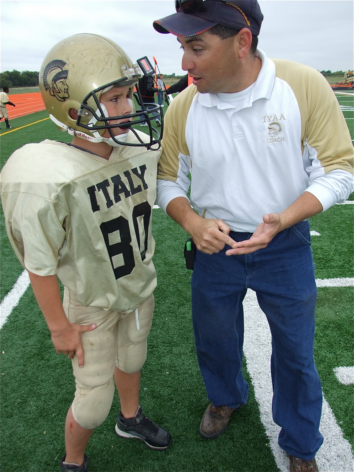 Blood and guts — IYAA President and A-Team head coach, Jason Escamilla, encourages Issac Salcido to keep up his gutsy performance while Isaac takes a break to check his scraped leg. (Barry Byers)