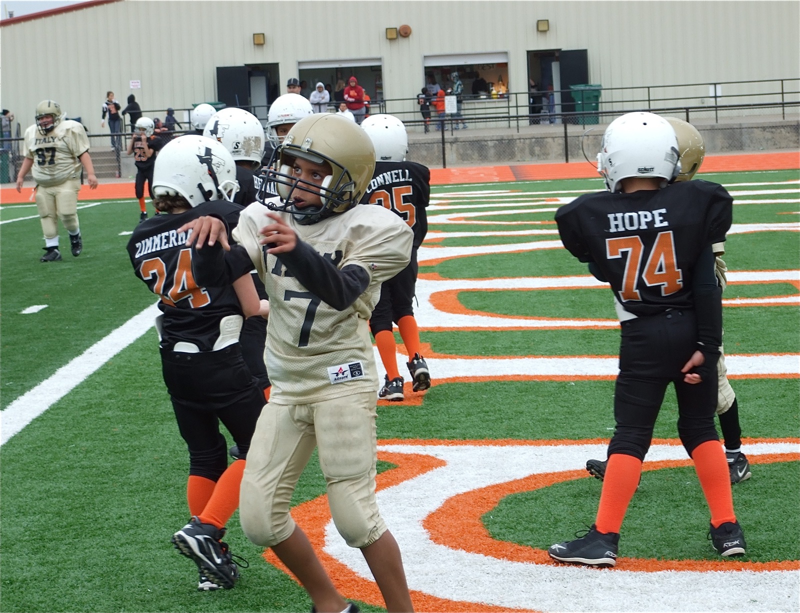 IYAA Gladiators win all three games against the Yellow Jackets « previous story album next » Tylan scores again — Tylan tosses the ball to, Mr. Referee, after he scored 6-points causing Ferris to lose all hope. (Barry Byers) Download original photo