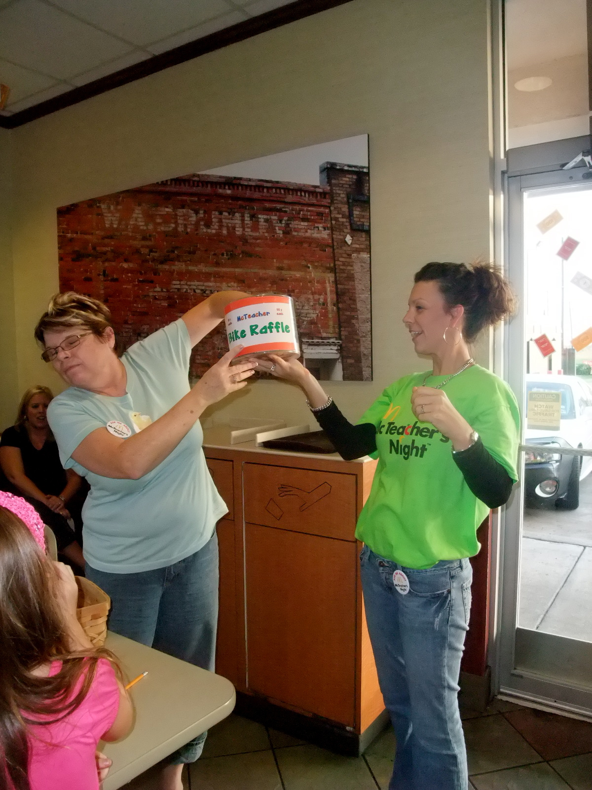 McTeacher Night at McDonalds « previous story album next » Who’s the Lucky Winner? — Paula Mandrell is pulling out the winning raffle ticket for the shiny red bike. (Cindy Sutherland) Download original photo