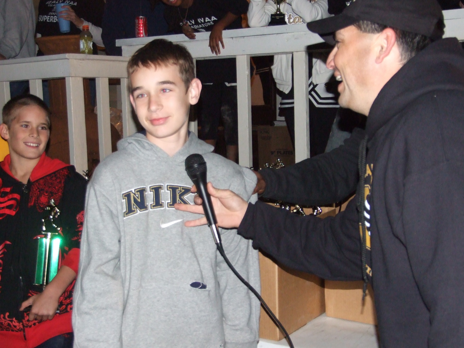 Ryan sums it all up — The IYAA A-Team’s Isaac Salcido (in red) and head coach Jason Escamilla chuckle as Ryan Connor, who will be moving on to the Junior High level next season, sums up his IYAA experience in just one word, “Thanks.” The A-Team finished as Conference Championship Finalist this season. (Barry Byers)