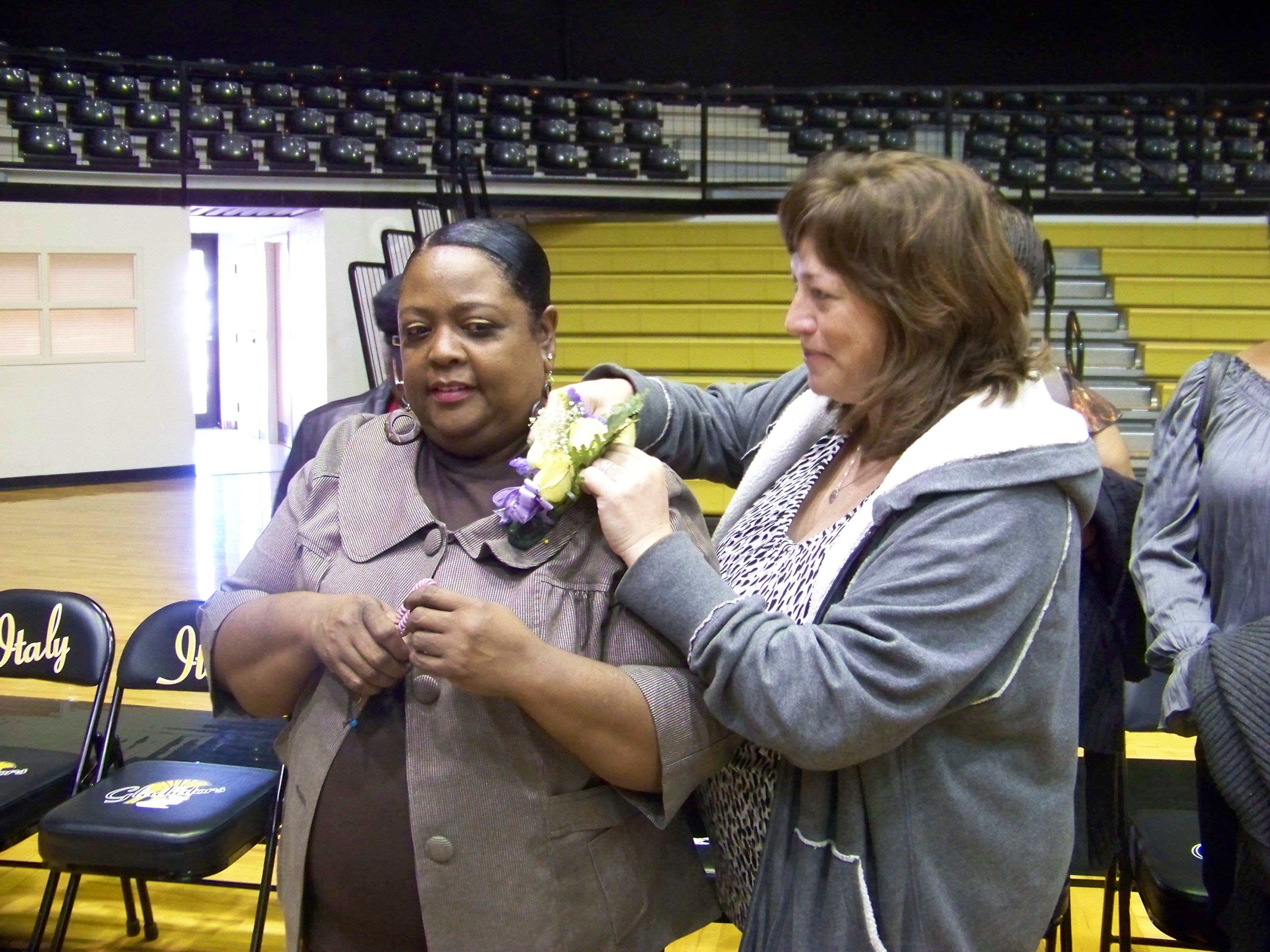 Vivian Moreland receives top teaching award « previous story album next » Corsage with purple ribbon of course! — Jennifer Bales helps Moreland with her corsage. (Kelly Lewis) Download original photo