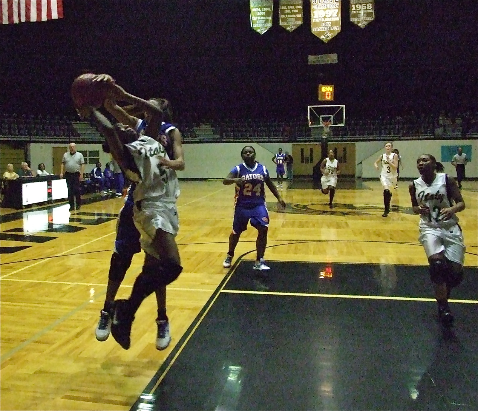 Lady Gladiators & Gladiators perform at high levels against Gateway « previous story album next » Copeland flies in — Freshman point guard Jameka Copeland(5) survives a Gator attack on her way to the rack. (Barry Byers) Download original photo
