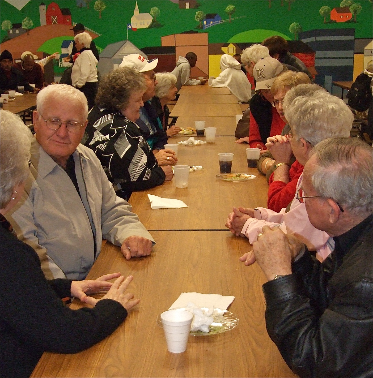 Reminiscing — Honored players from the 1955 girls semi-finalist team and the 1974 boys regional finalist team mingled after the games inside the Italy High School cafeteria. (Barry Byers)