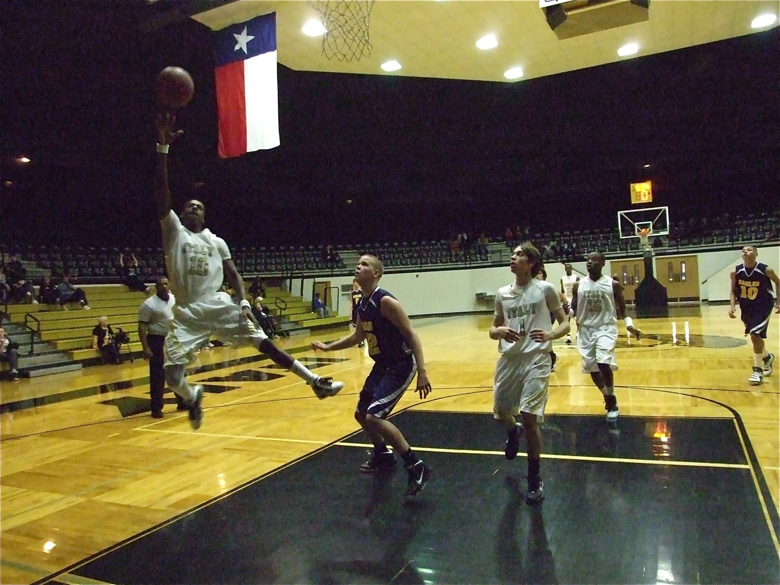 Image: John Isaac(10) gets Italy on the board with style — Italy Head Coach Kyle Holley started all 5 seniors in their final home game against the Waxahachie Advantage Eagles. The Eagles were winning 5-0 when senior John Isaac hit 3 jumpers in a row to give the Gladiators a 6-5 lead. The Gladiators continued to lead the rest of the way before finally winning 104-40.