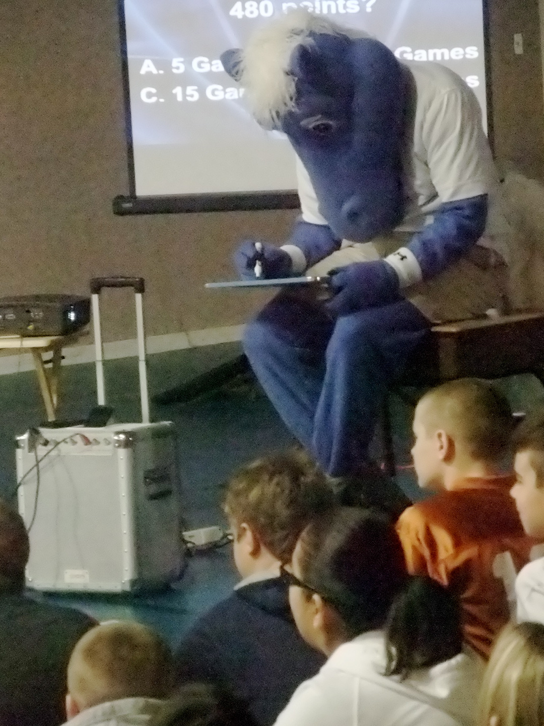 Champ the Maverick’s blue horse mascot visits Stafford « previous story album next » This is Hard — Champ was told to slow down and read all the answers on his test before he turns it in. (Cindy Sutherland) Download original photo