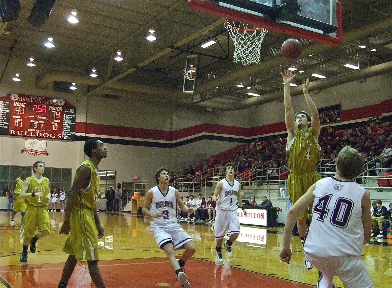 Heath Clemons(2) bounce passes to Ryan Ashcraft(4) for 2-points — After bounce passing around a DeLeon Bearcat defender, Italy’s Heath Clemons(2) casually watches teammate Ryan Ashcraft(4) make the bank shot as the Gladiators win the 1A area championship, 85-50. (Barry Byers)