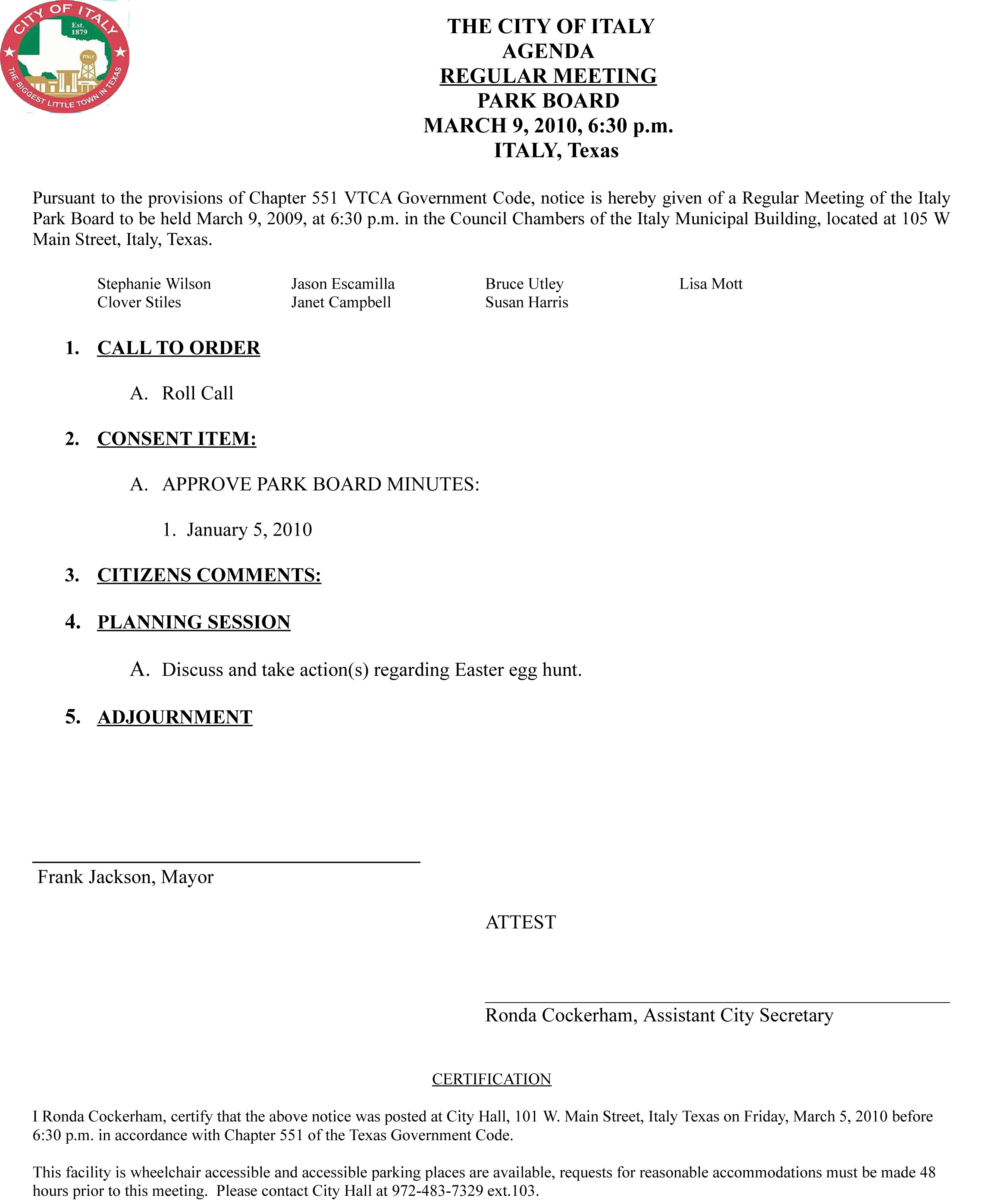 Agenda: Italy Park Board Meeting, March 9, 2010 « previous story album next » Agenda Download original photo