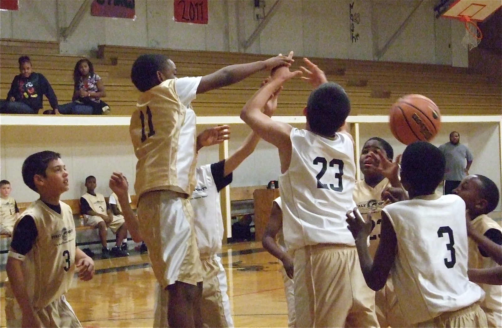 Blocked! — Italy 29’s Cameron Carter(11) blocks a shot attempt by Italy 31. In the end, however, Italy 31 managed to pull off the upset 46-42 in the final game of the season for both teams. (Barry Byers)