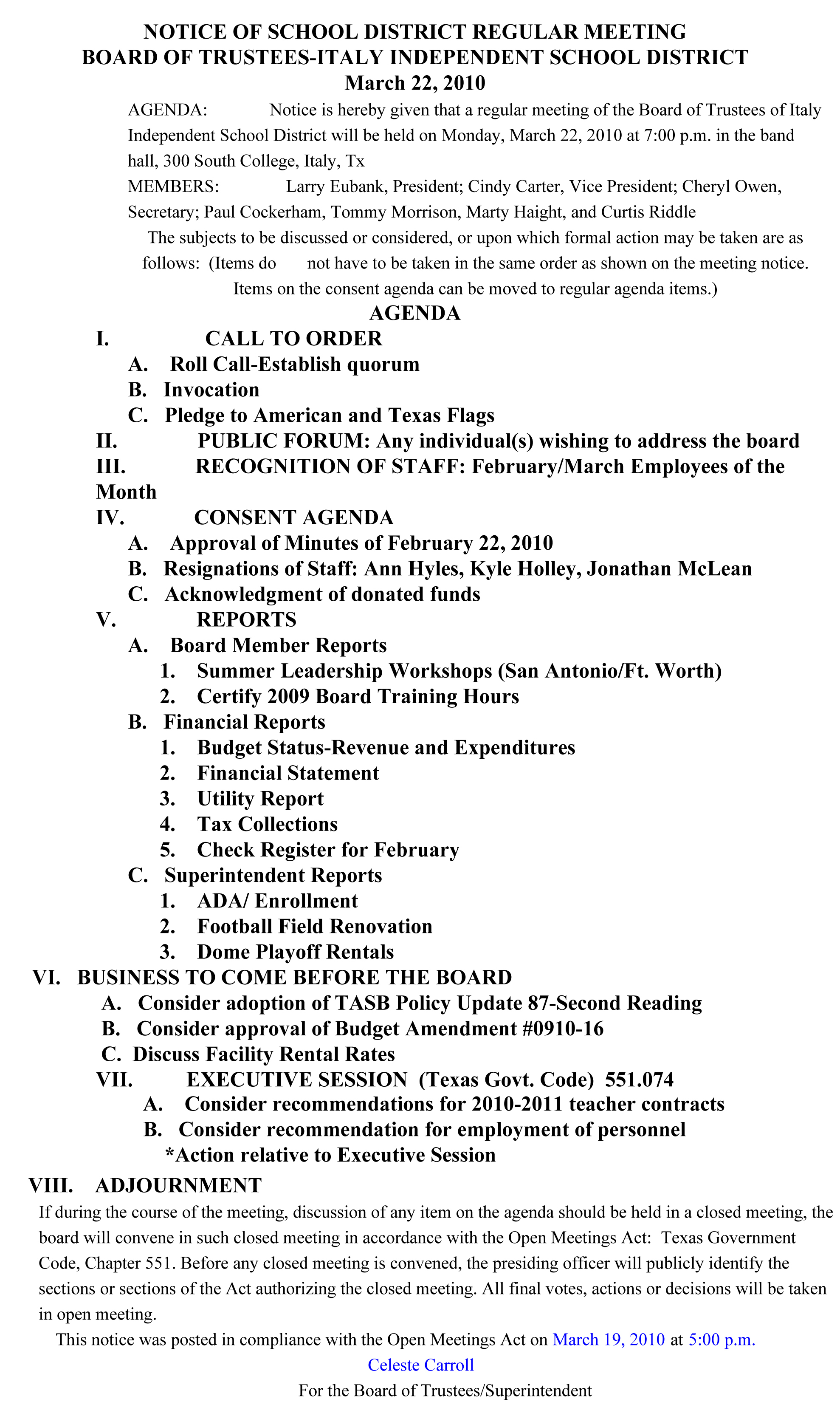 Agenda: Italy ISD School Board Meeting, March 22, 2010 « previous story album next » Agenda Download original photo