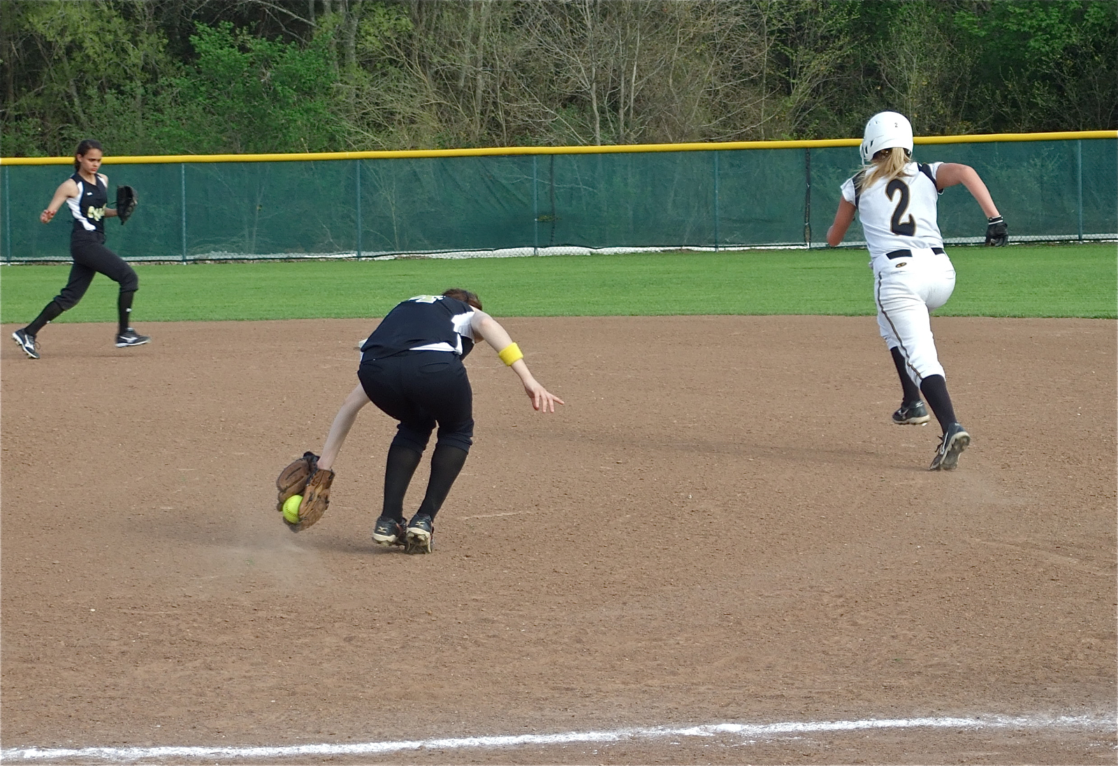 Lady Gladiators battle the elements in Hubbard « previous story album next » Backhanded out — First baseman Drew Windham backhands a grounder and then throws to shortstop Anna Viers at second base to get the Lady Jag runner out. (Barry Byers) Download original photo