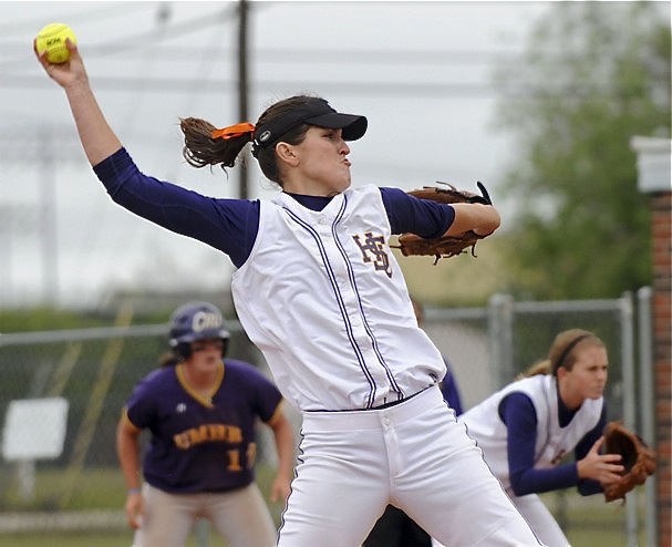 Megann Lewis – Queen of the hill — Hardin-Simmons pitcher Megann Lewis throws the ball during a game with Mary Hardin-Baylor University on Sunday, April 18, 2010. Lewis was recently honored by the coaches of the ASC and named the American Southwest Conference West Division Pitcher of the Year. (Nellie Doneva/Reporter-News)