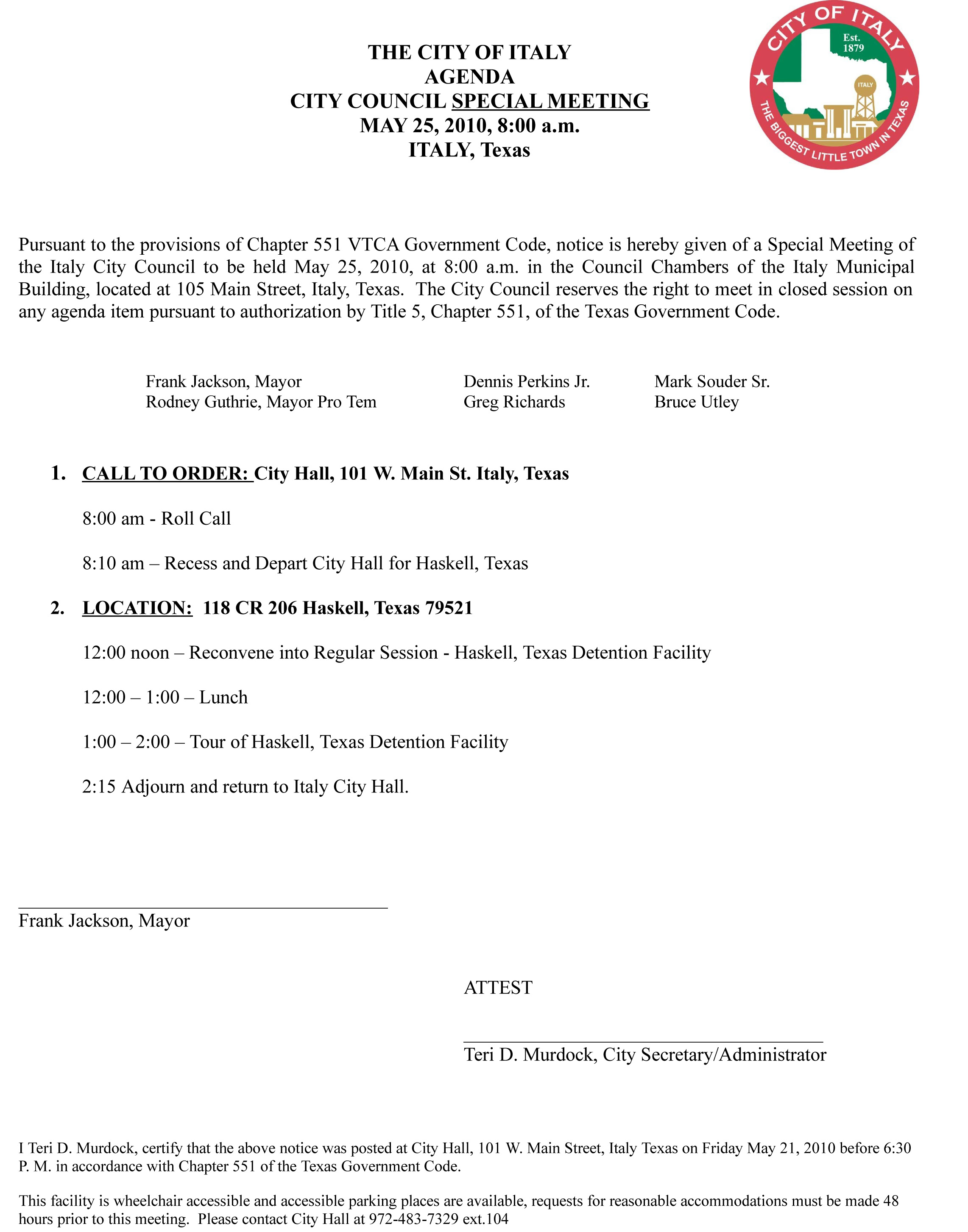 Agenda: Italy City Council Special Meeting, May 25, 2010 « previous story album next » Download original photo