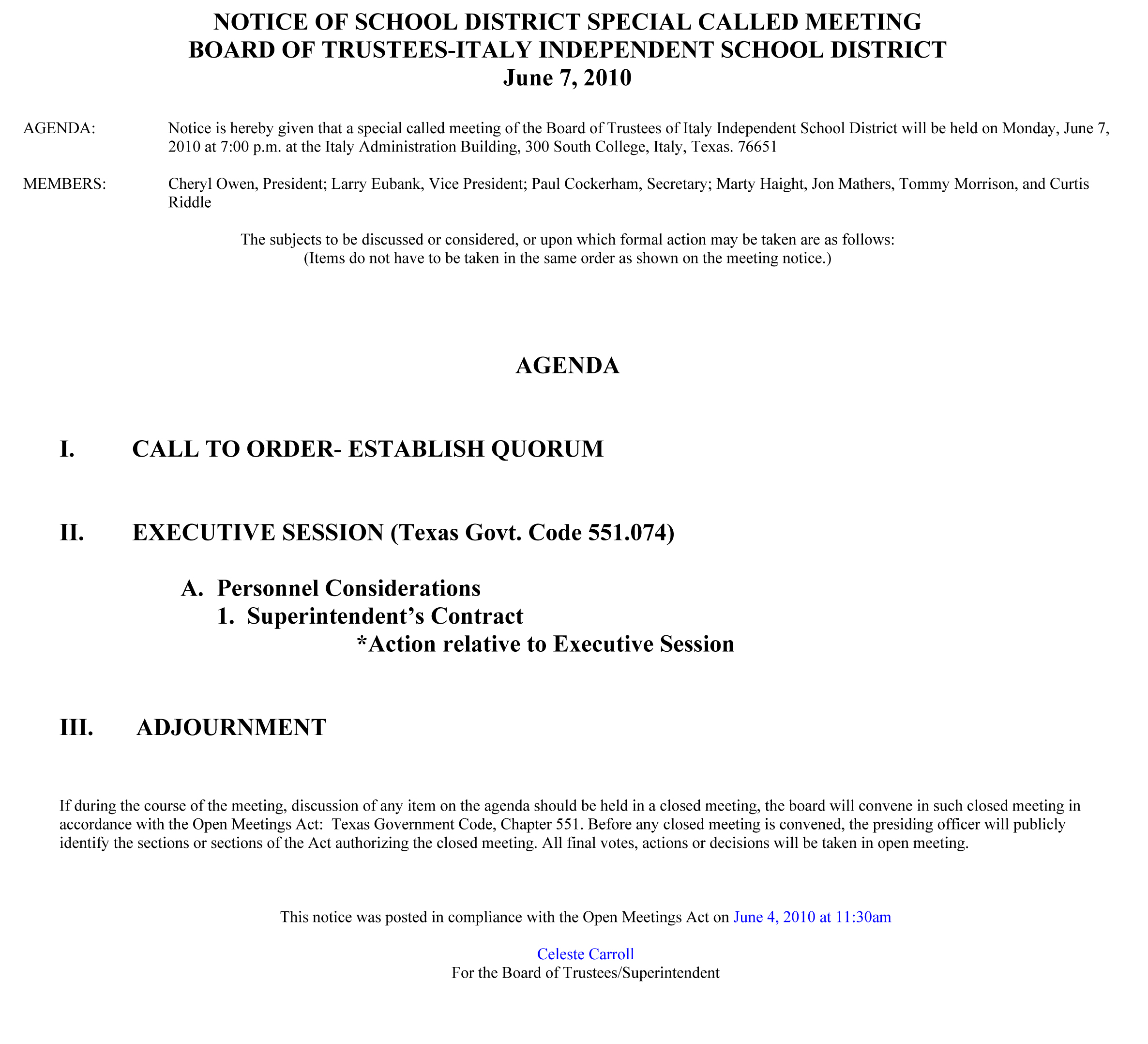 Agenda: Special Called Italy ISD School Board Meeting « previous story album next » Agenda Download original photo