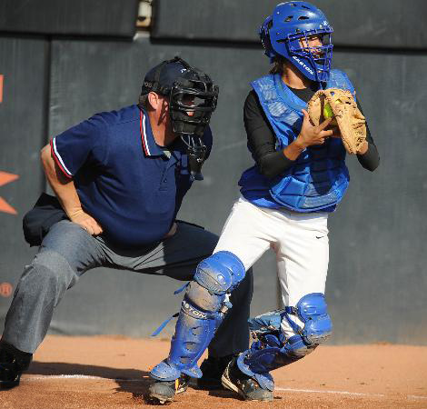 Behind the masks — UIL umpire Joe Windham scans the action behind the Waco Robinson Rockettes’ senior catcher, Crystal Alonzo, at McCombs Field on the University of Texas campus during the 3A semifinal game between Robinson and Paris North Lamar. (Rod Aydelotte, Waco Tribune Herald)