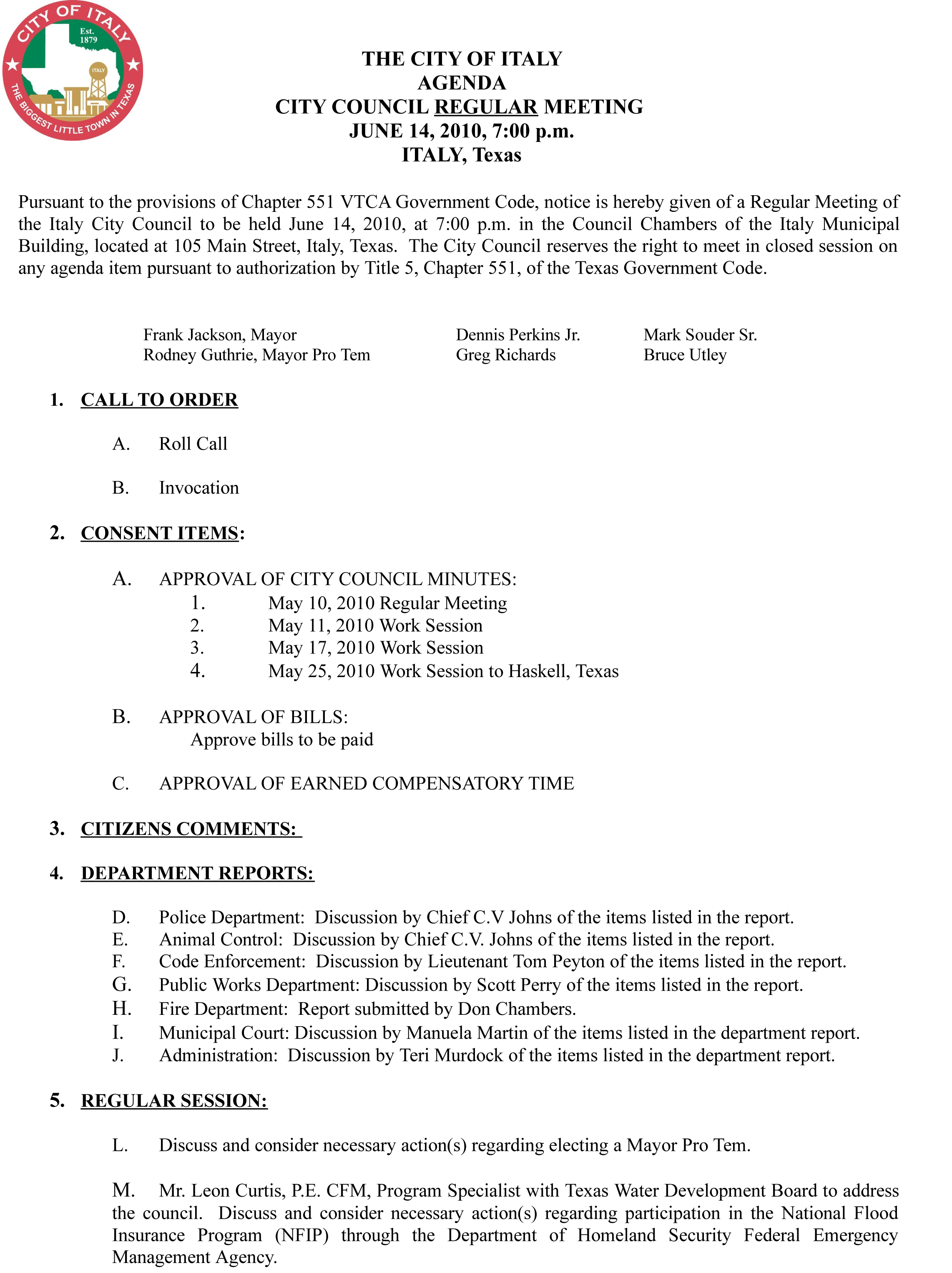 Agenda: Italy City Council Meeting, June 14, 2010 « previous story album next » Agenda, page 1 Download original photo